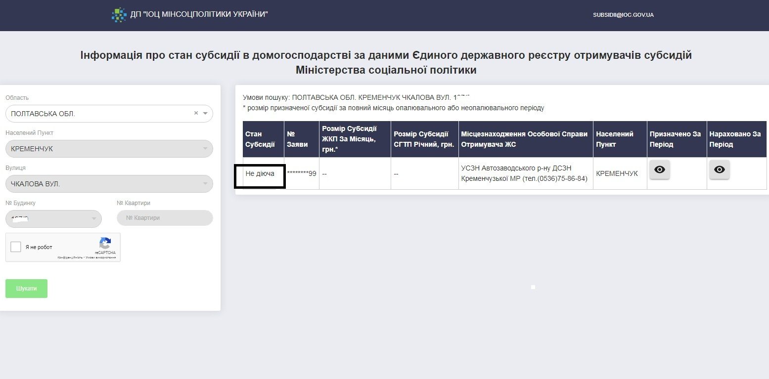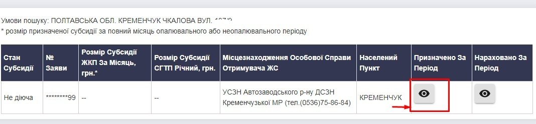 3. Статус вашої субсидії (нарахована вона, чи ні) відобразиться в таблиці. У нашому випадку субсидія не діюча - тобто на поточний період вона не призначена.