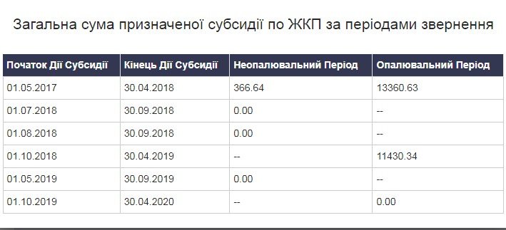 2. З’явиться вікно, у якому вказані суми допомоги. Зверніть увагу: суми різняться залежно від сезону (опалювальний або ні). Також у цьому вікні вказані дати, у які була призначена субсидія. Вони відображаються, навіть якщо наразі субсидія неактивна.