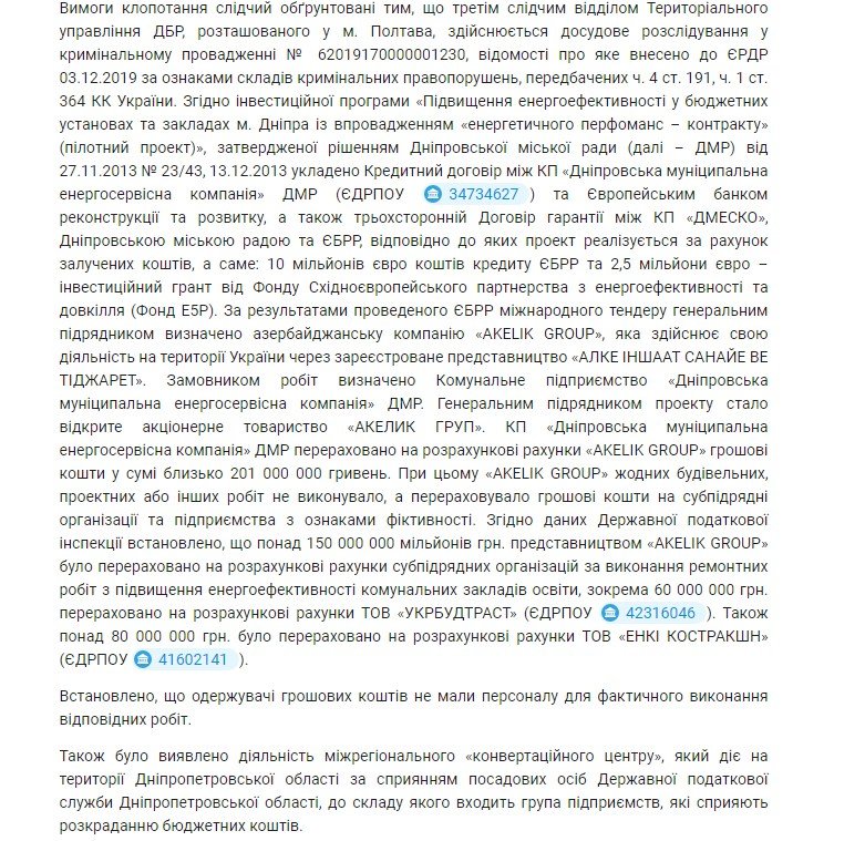«Згідно даних Державної податкової інспекції встановлено, що понад 150 000 000 мільйонів грн. представництвом «AKELIK GROUP» було перераховано на розрахункові рахунки субпідрядних організацій за виконання ремонтних робіт з підвищення енергоефективності комунальних закладів освіти, зокрема 60 000 000 грн. перераховано на розрахункові рахунки ТОВ «УКРБУДТРАСТ» (ЄДРПОУ 42316046). Також понад 80 000 000 грн. було перераховано на розрахункові рахунки ТОВ «ЕНКІ КОСТРАКШН» (ЄДРПОУ 41602141).