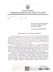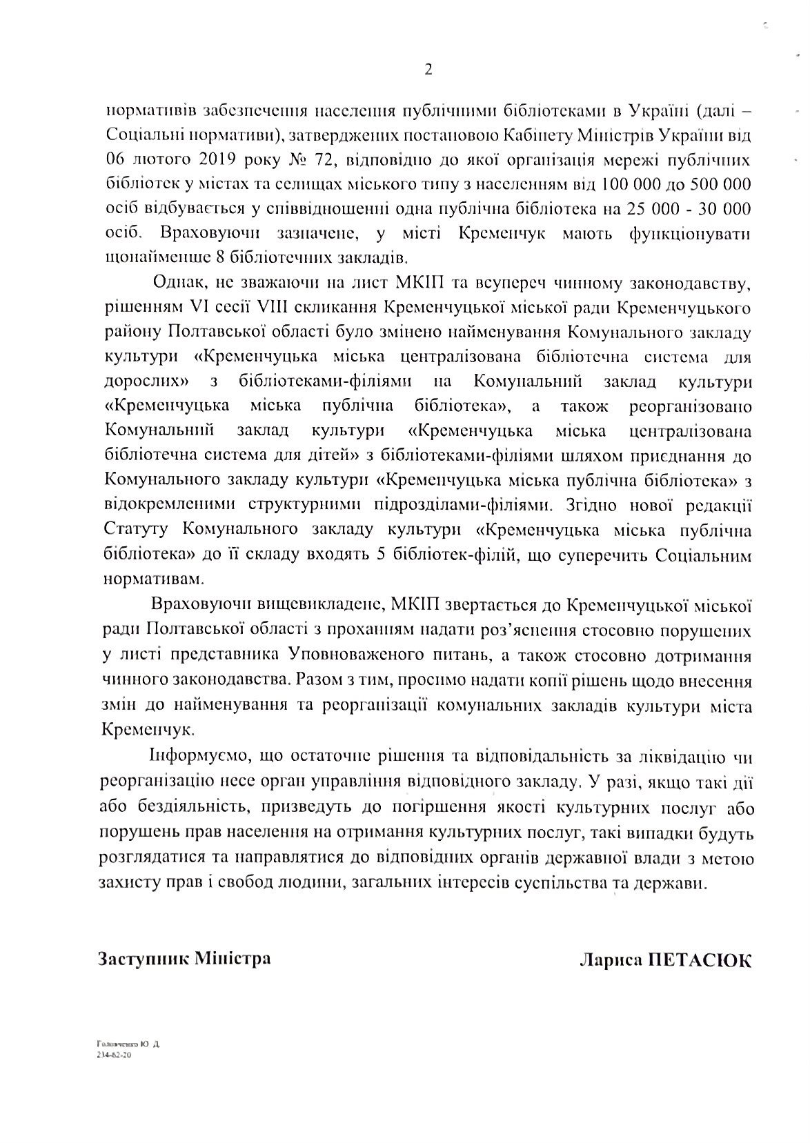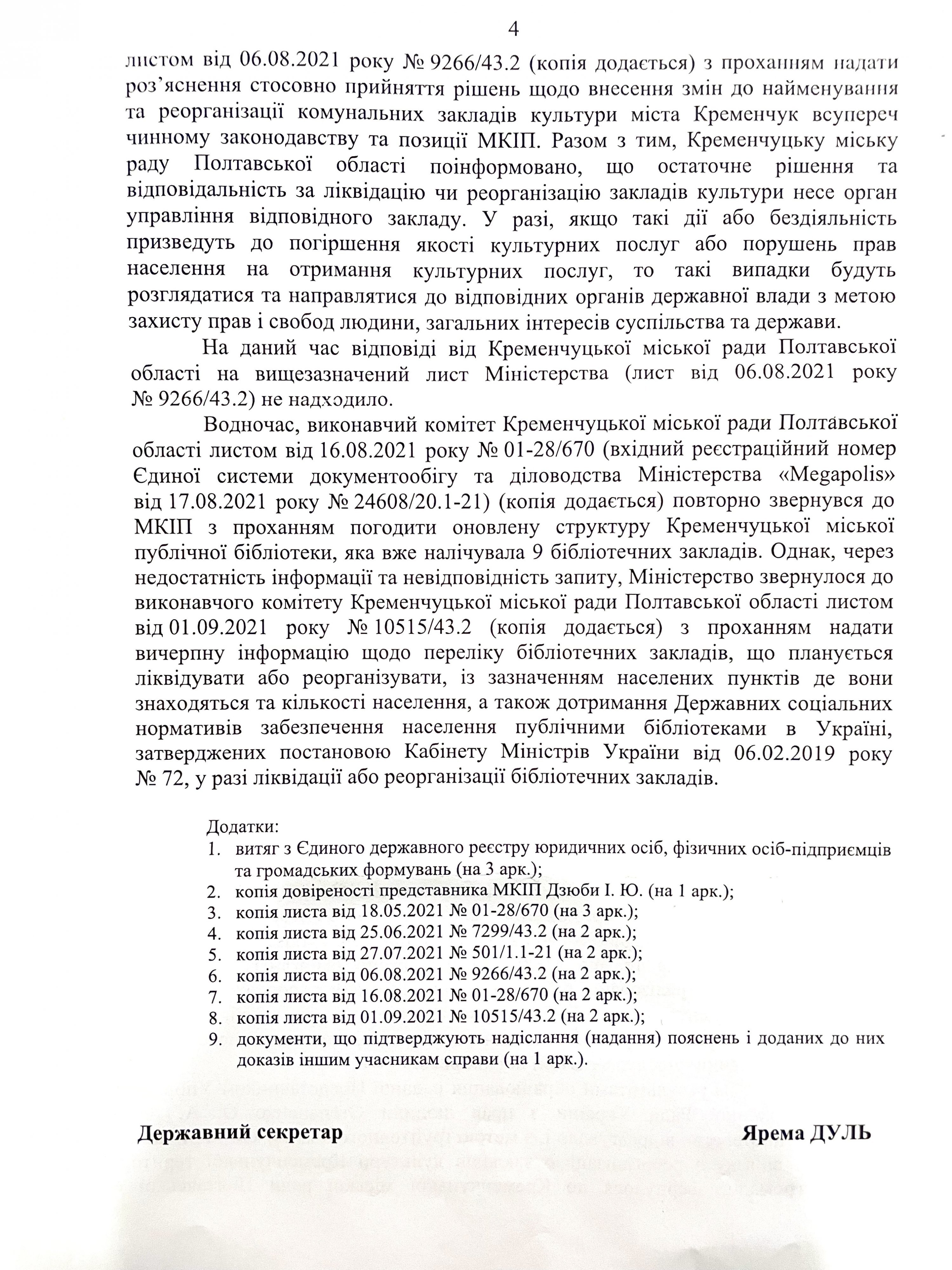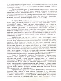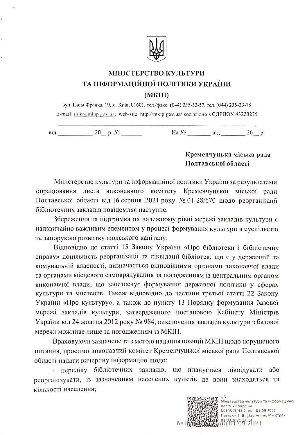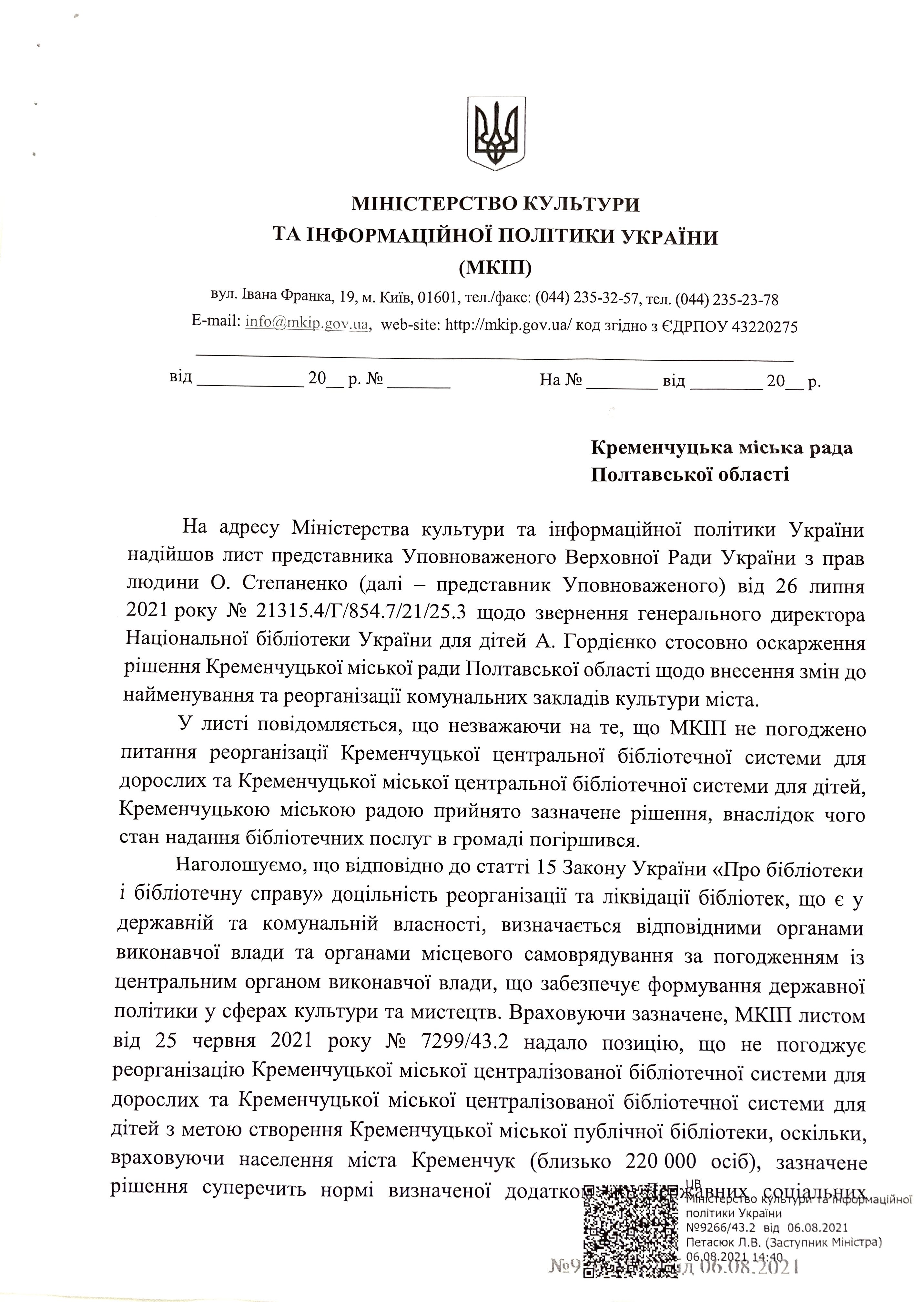 Іншим доволі резонансним фактом у цій справі є найперший лист Міністерства культури та інформаційної політики України, відповідно до якого профільний орган не погодив реорганізацію Кременчуцької міської централізованої бібліотечної системи. Саме цей документ і спробували приховати розробники горезвісного проєкту від депутатів напередодні самого голосування. Як виявилося згодом, практика замовчування фактів та ігнорування вказівок стала усталеною і доволі звичною для підлеглих нашого міського голови. 18 серпня, на позачерговій сесії, протиснувши більшістю голосів друге протиправне рішення, депутатам забули сказати про лист, який надійшов із Міністерства культури до Кременчуцької міської ради двома тижнями раніше. Саме в листі від 6 серпня посадовці столиці висловлюють своє занепокоєння і вимагають пояснень стосовно рішення, яке було прийняте всупереч позиції міністерства, а також вказують на факт прискіпливої уваги з боку керівництва Національної бібліотеки України для дітей та Уповноваженого Верховної Ради України з прав людини. Натомість, навіть через місяць, відповіді від Кременчуцької міської ради на вищезазначений лист не надходило. Так само без відповіді залишився і лист міністерства вже від 1 вересня, яким останнє звернулося до кременчуцьких посадовців через необґрунтованість і недостатність інформації та невідповідність запиту погодити оновлену структуру рішення міськради, де назви пунктів видачі книг змінили на бібліотечні філії.
