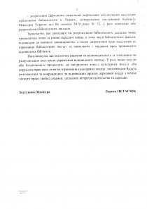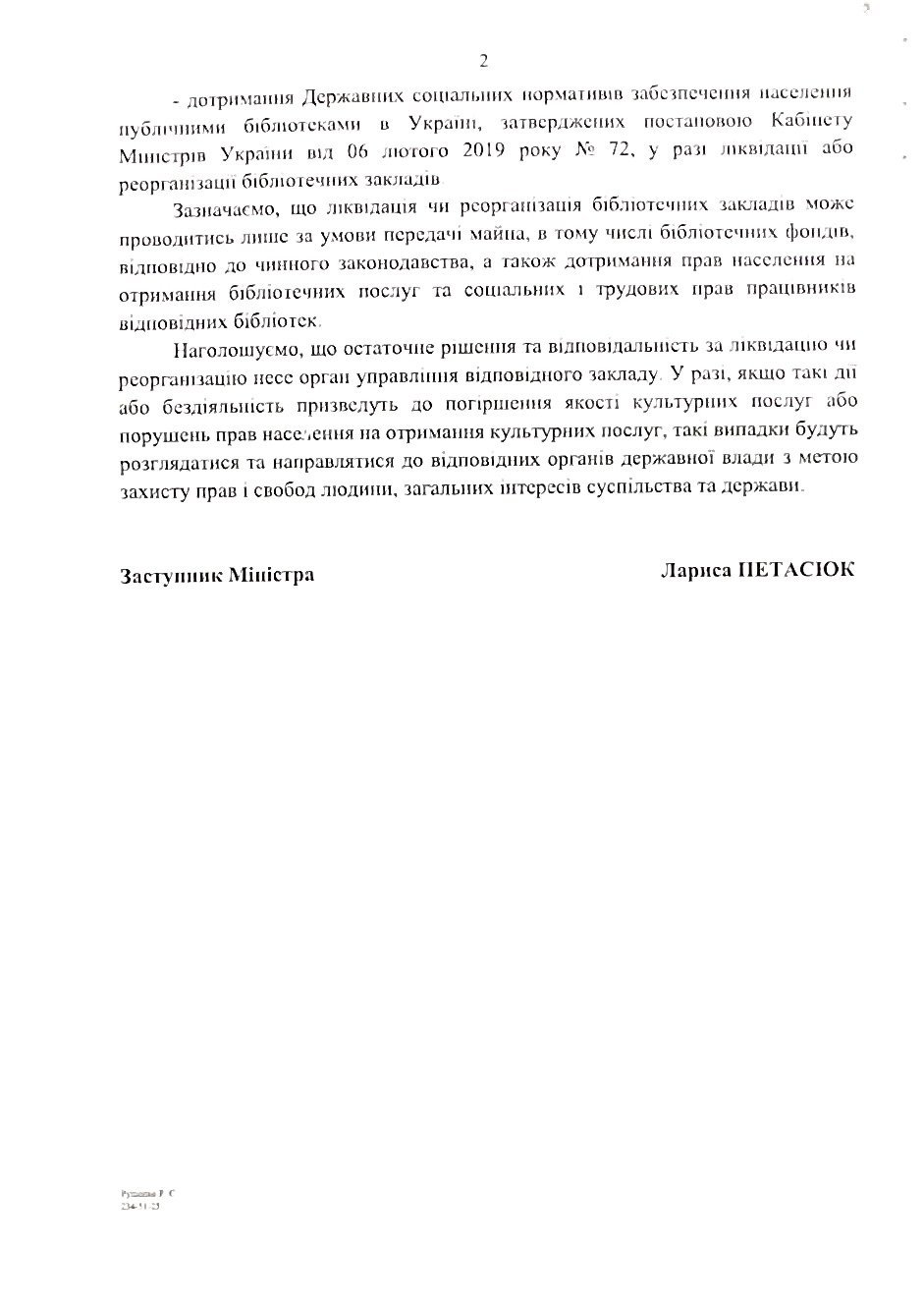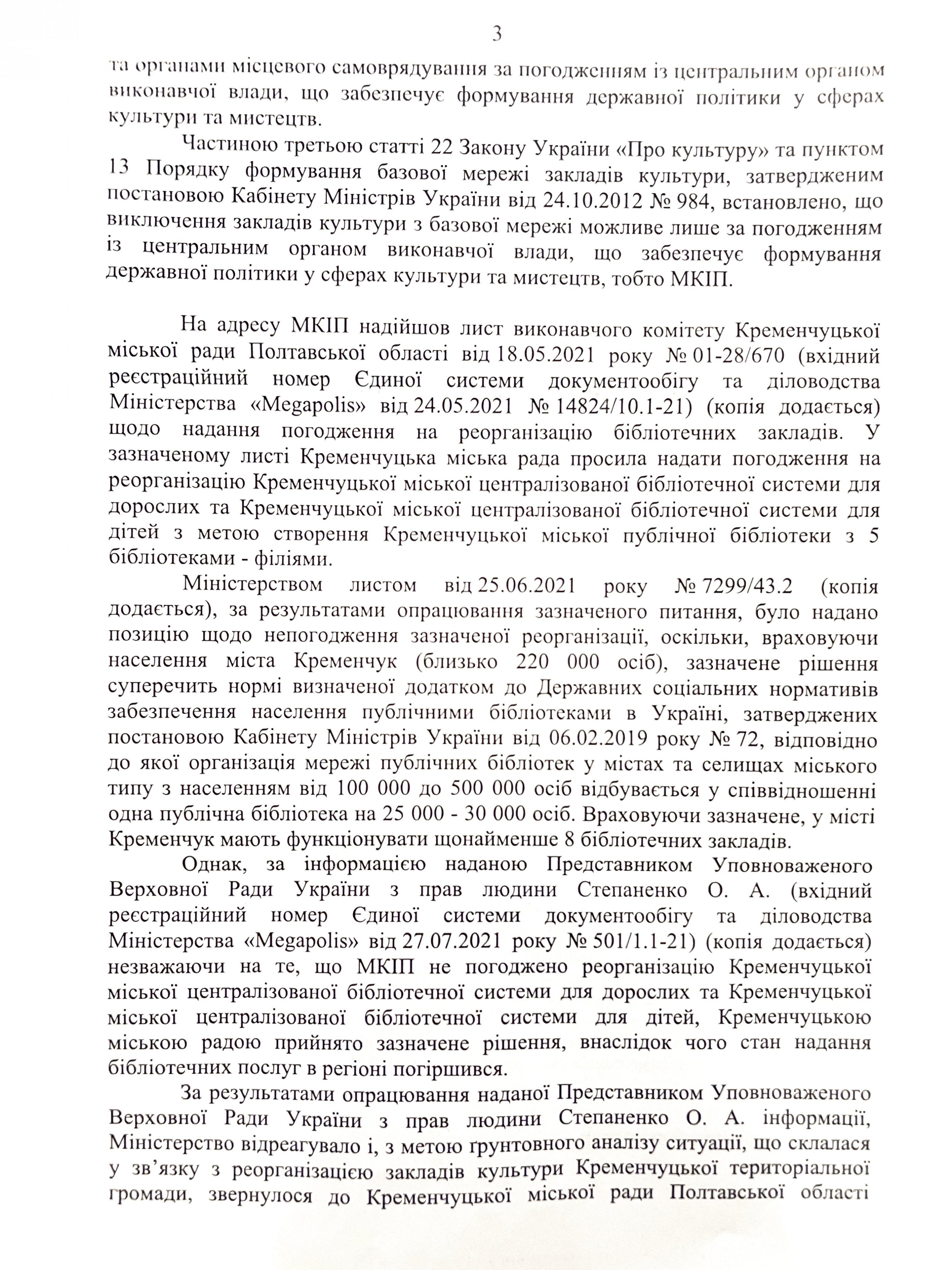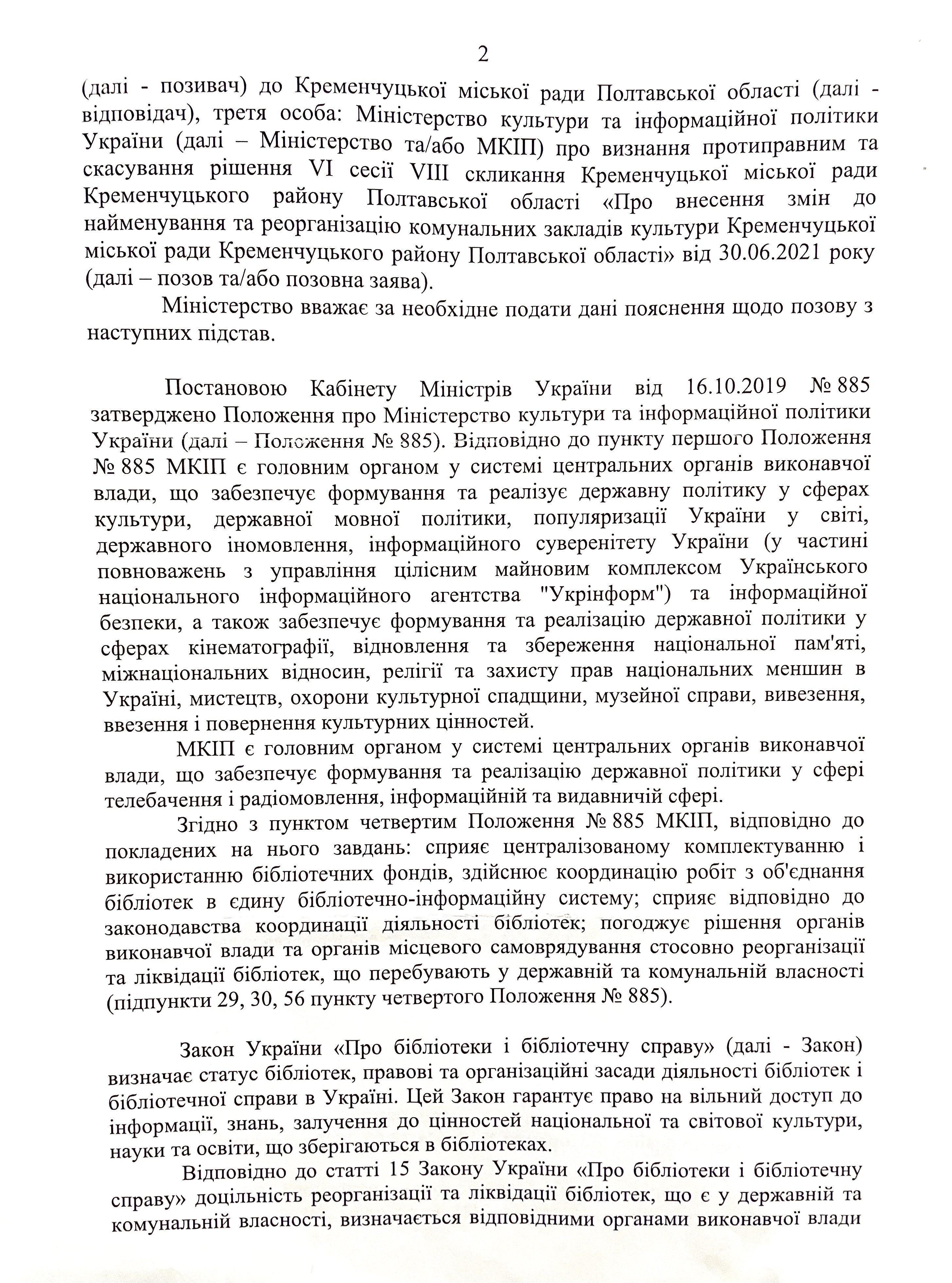 В якості третьої особи до справи залучили Міністерство культури та інформаційної політики України. Саме профільний орган виконавчої влади, надіславши пояснення щодо позову депутата Лазоренка, і пролив світло на цю справу. Як вбачається з офіційної відповіді міністерства, кременчуцькі чиновники не лише систематично ігнорують їхні рекомендації щодо процесу реорганізації бібліотек, а й відмовляються надавати відповіді і роз’яснення стосовно тих рішень, які й оскаржує депутат.