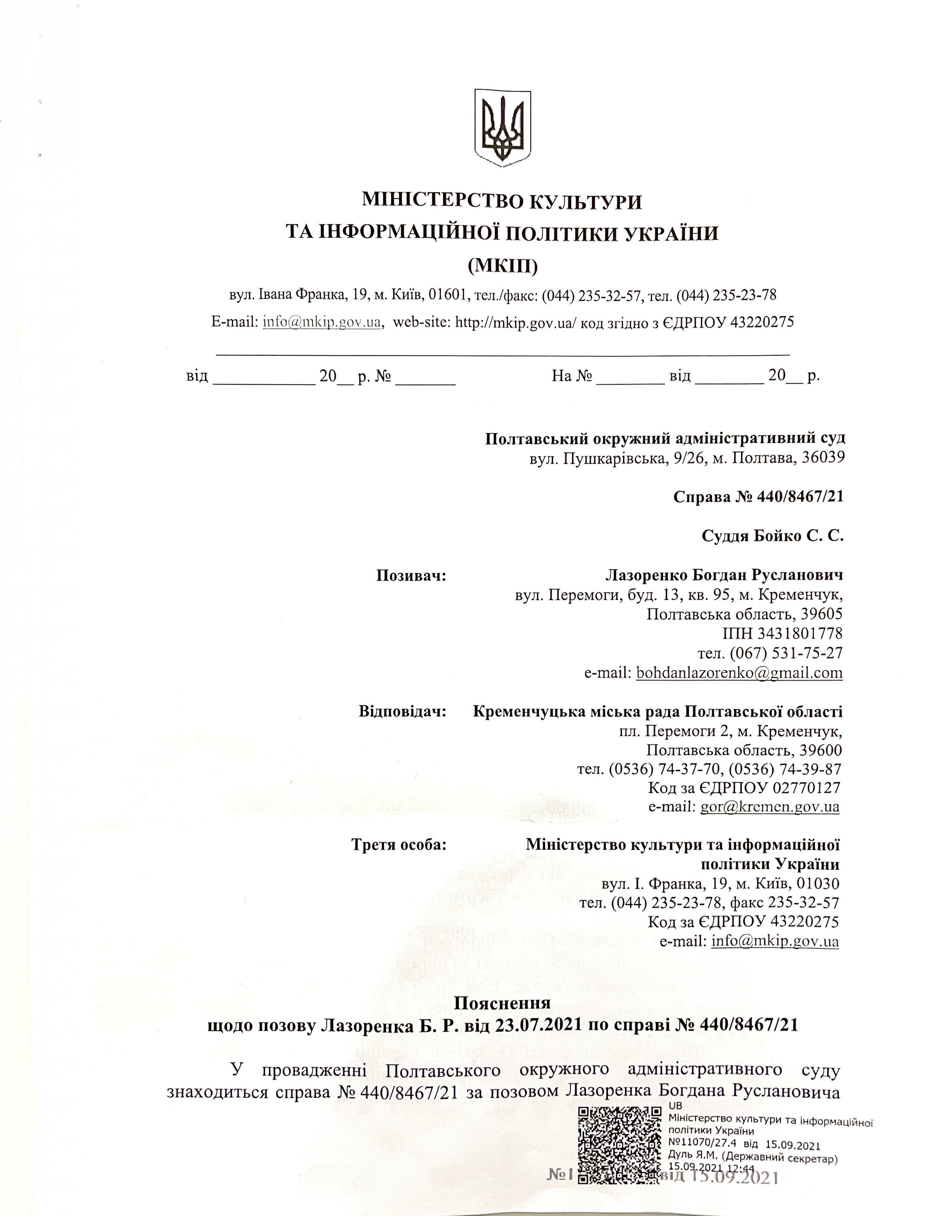 Пояснення Міністерства культури та інформаційної політики, щодо позову Лазоренка Б.Р.