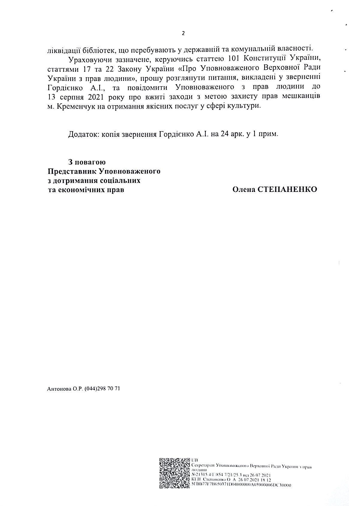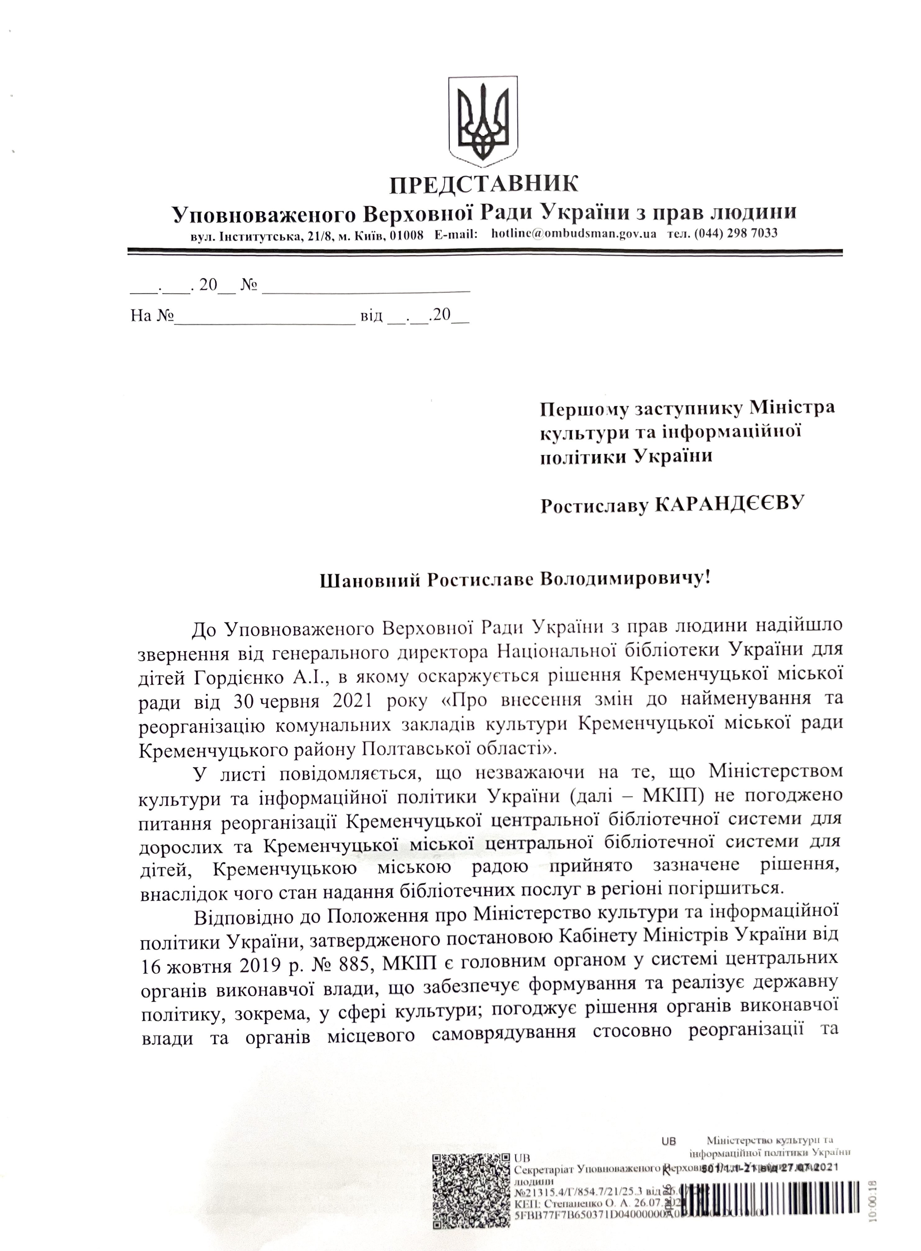 Виходячи з інформації, яку надіслало Міністерство культури та інформаційної політики України Богдану Лазоренку, можна зробити висновок, що ситуація, пов’язана із закриттям бібліотек, привернула увагу значної кількості високопосадовців. Після набуття суспільного розголосу у справу втрутився генеральний директор Національної бібліотеки України для дітей А.І. Гордієнко, який і звернувся до Уповноваженого Верховної Ради України з прав людини. Керівництво Національної бібліотеки України для дітей чітко зазначило, що внаслідок прийняття такого рішення якість надання бібліотечних послуг в регіоні значно погіршиться. В свою чергу, представник омбудсмена просить міністерство розглянути питання, викладені у адресованому до них зверненні, та повідомити Уповноваженого з прав людини до 13 серпня 2021 року про вжиті заходи з метою захисту прав мешканців Кременчука на отримання якісних послуг у сфері культури. Не важко здогадатися, що жодних заходів, про які йде мова, міські владники забезпечувати не стали, ба, навіть вирішили не відповідати міністерству на їхні численні листи і звернення.
