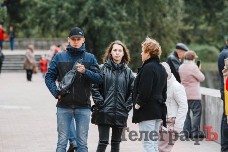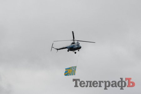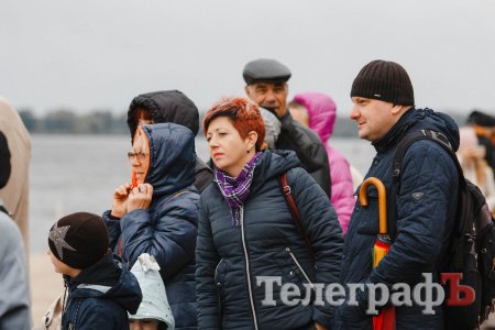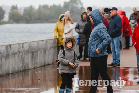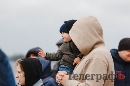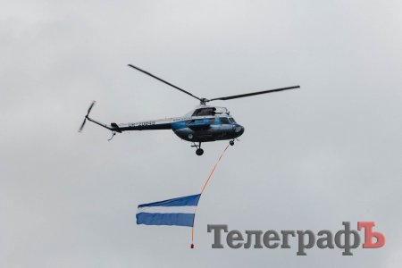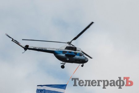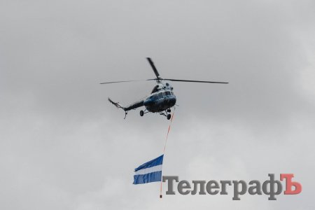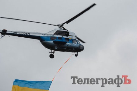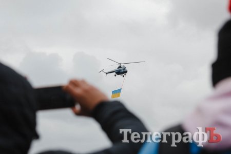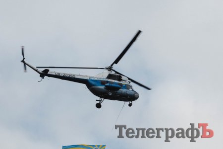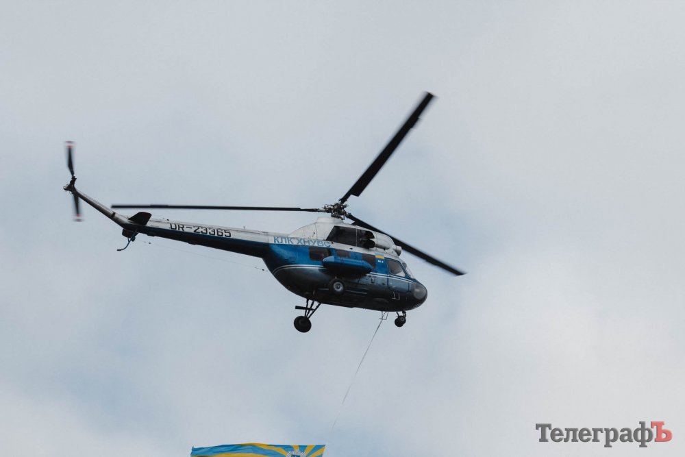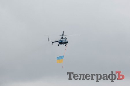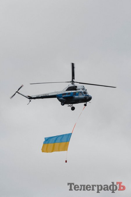 Пролетіли над Дніпром три вертольоти Кременчуцького льотного коледжу. Перший летів із жовто-блакитним стягом України, другий - ніс синьо-білий прапор Кременчука, а третій - прапор навчального закладу.