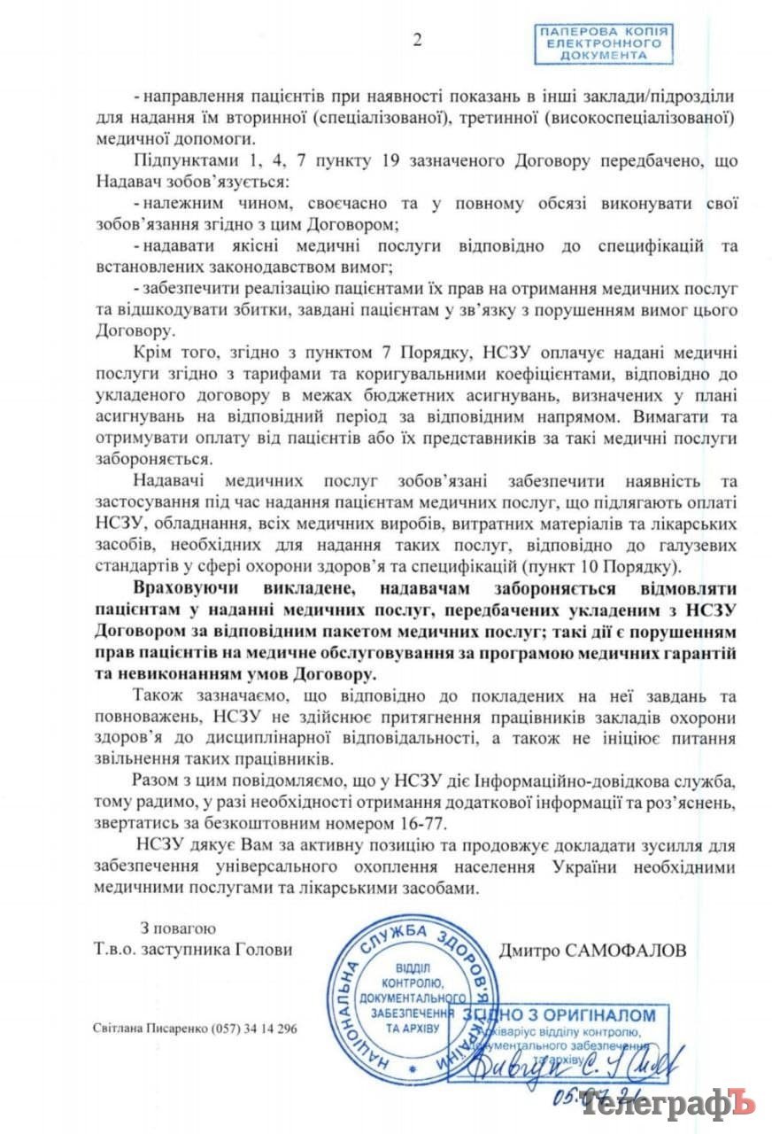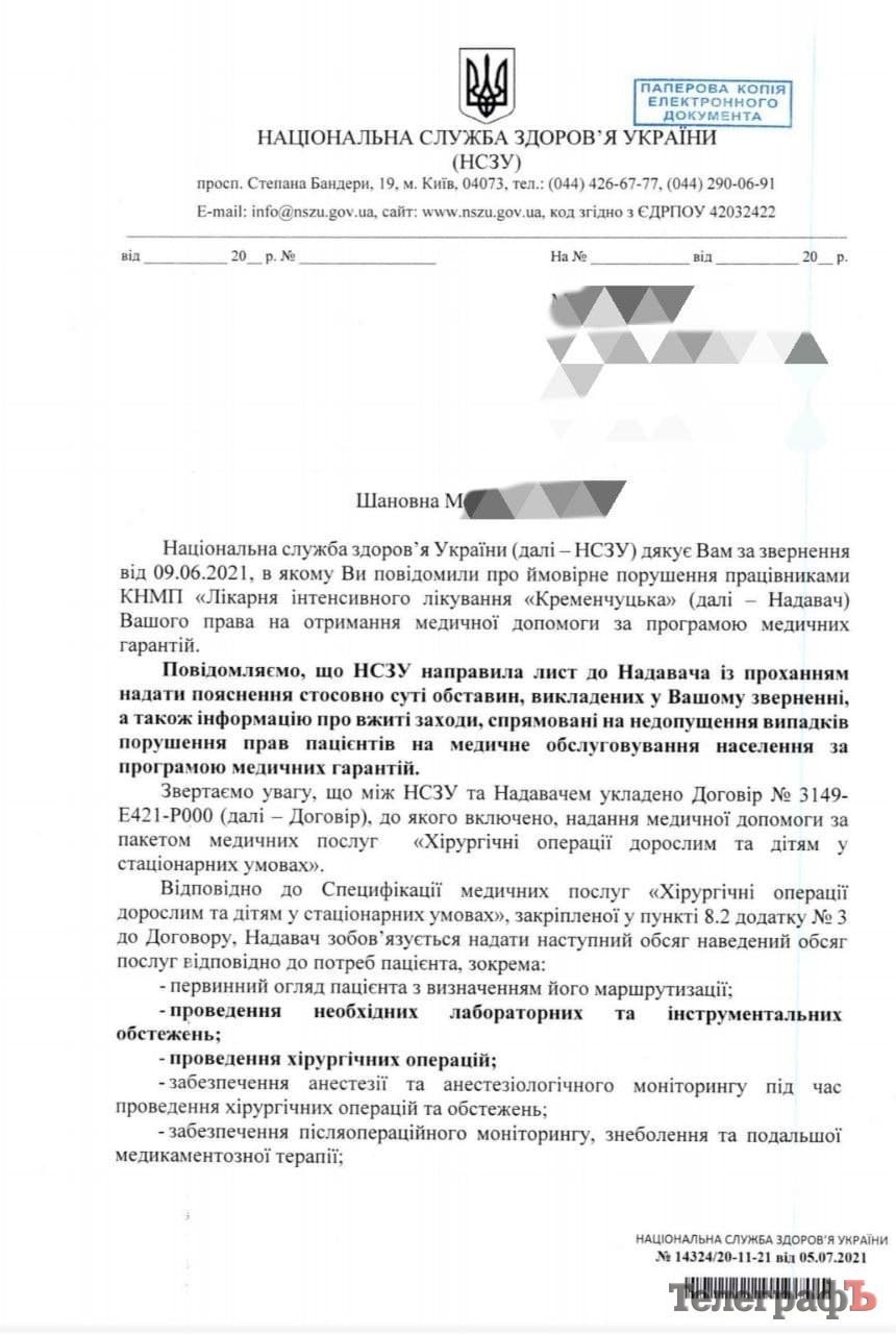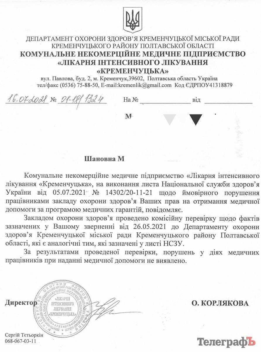 Ми зв’язалися з пані М., яка з радістю поділилася фотокопіями відповідей, які отримала від НСЗУ та директора ЛІЛ «Кременчуцька» Оксани Корлякової. Як бачимо, перевіряючі дійшли висновку, що ніяких порушень лікарі в своїй роботі не припустилися.