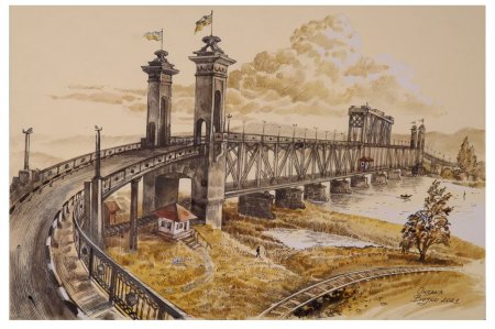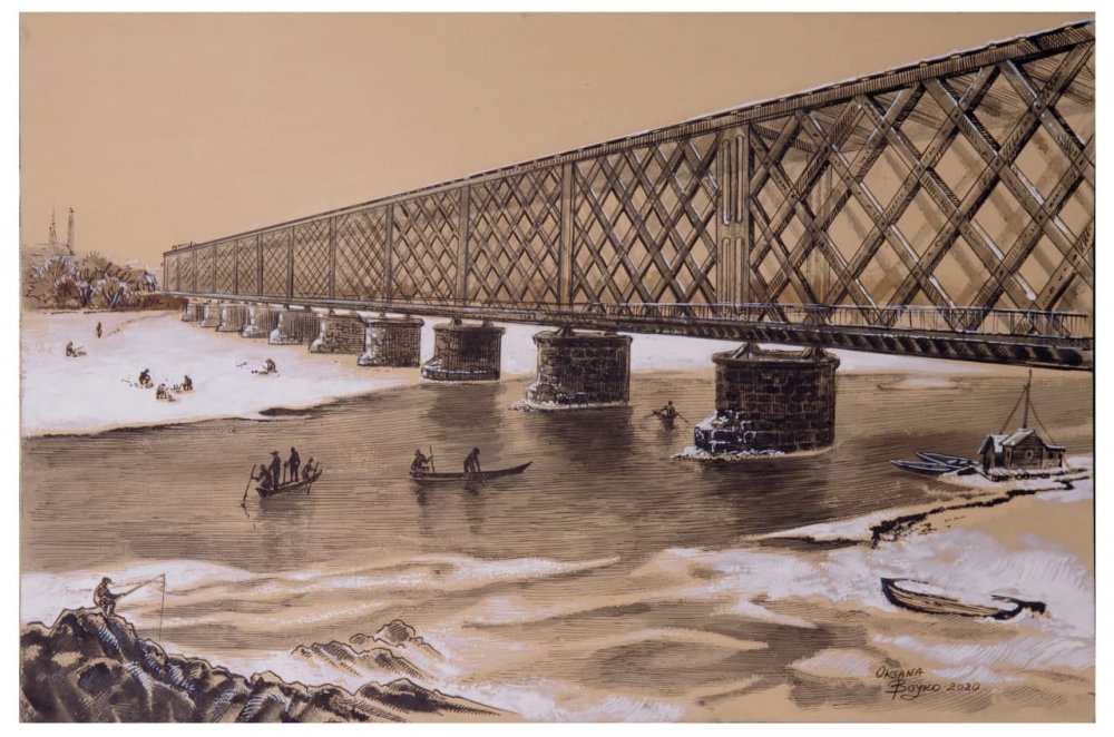 Політичні катаклізми та війни стали причиною багатьох руйнацій та відновлень. 9 липня 1941 року німецький літак зруйнував залізничний міст. На картині зображений історичний факт, як «Юнкерс 87» пустив димову шашку, імітуючи підбитого, через що артилерія з лівого берега припинила обстріл. У цей момент, спустившись низько над мостом, скинув бомби, поціливши у четверту 88-метрову ферму. Восени 41-го німці підняли і відновили обрушену конструкцію, влаштували оборонну зону.