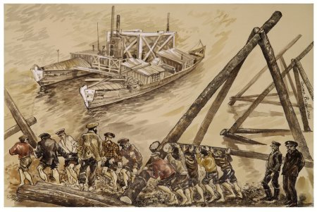 Круглі зруби об’єднували в піраміду на березі, й десяток сильних чоловіків опускали їх у воду, там підхоплювали човни й скидали вантаж з якорями на потрібне місце. Так забор обгороджували: кожні 5-10 метрів між козлами з’єднували щитами. Потім землесосами намивали пісок з дна ріки, кільцеву арену перемички робили герметичною і вибирали з середини воду. Осушивши тіло забори, починали розробку граніту: вручну відбійними молотками робили отвори, вставляли деревину і змочували її. Дерев’яний кілок набухав і розривав гранітний масив.