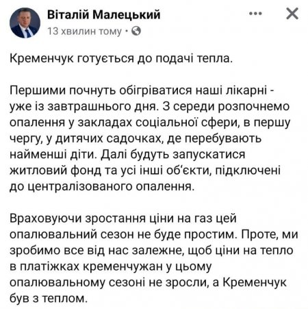Із завтрашнього дня почнуть обігріватися лікарні міста. А з середи (13 жовтня) з опаленням будуть дитсадки. Про це написав на своїй сторінці у фейсбуку мер Кременчука Віталій Малецький.