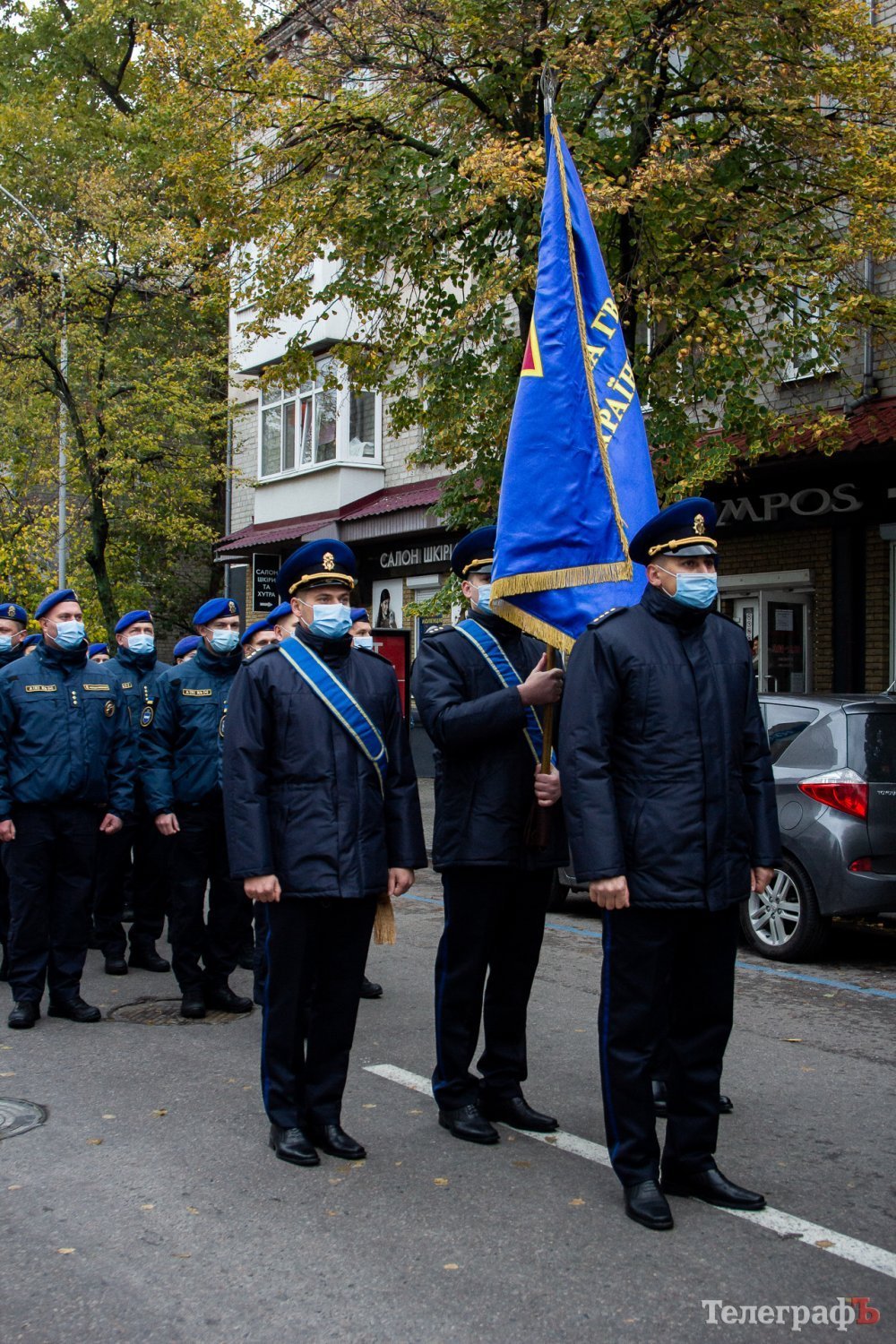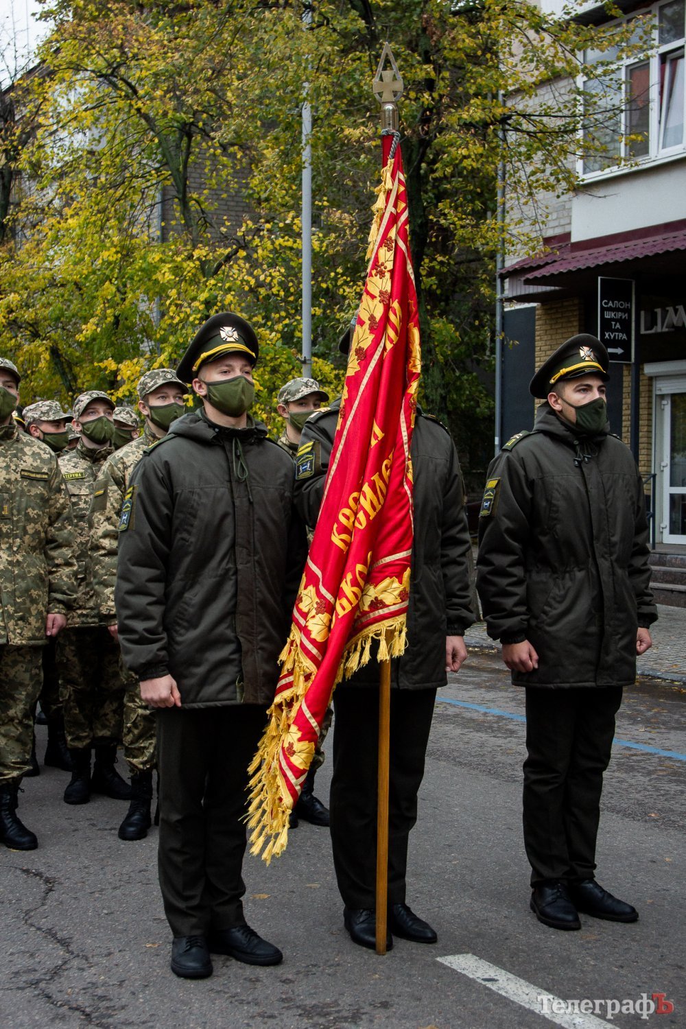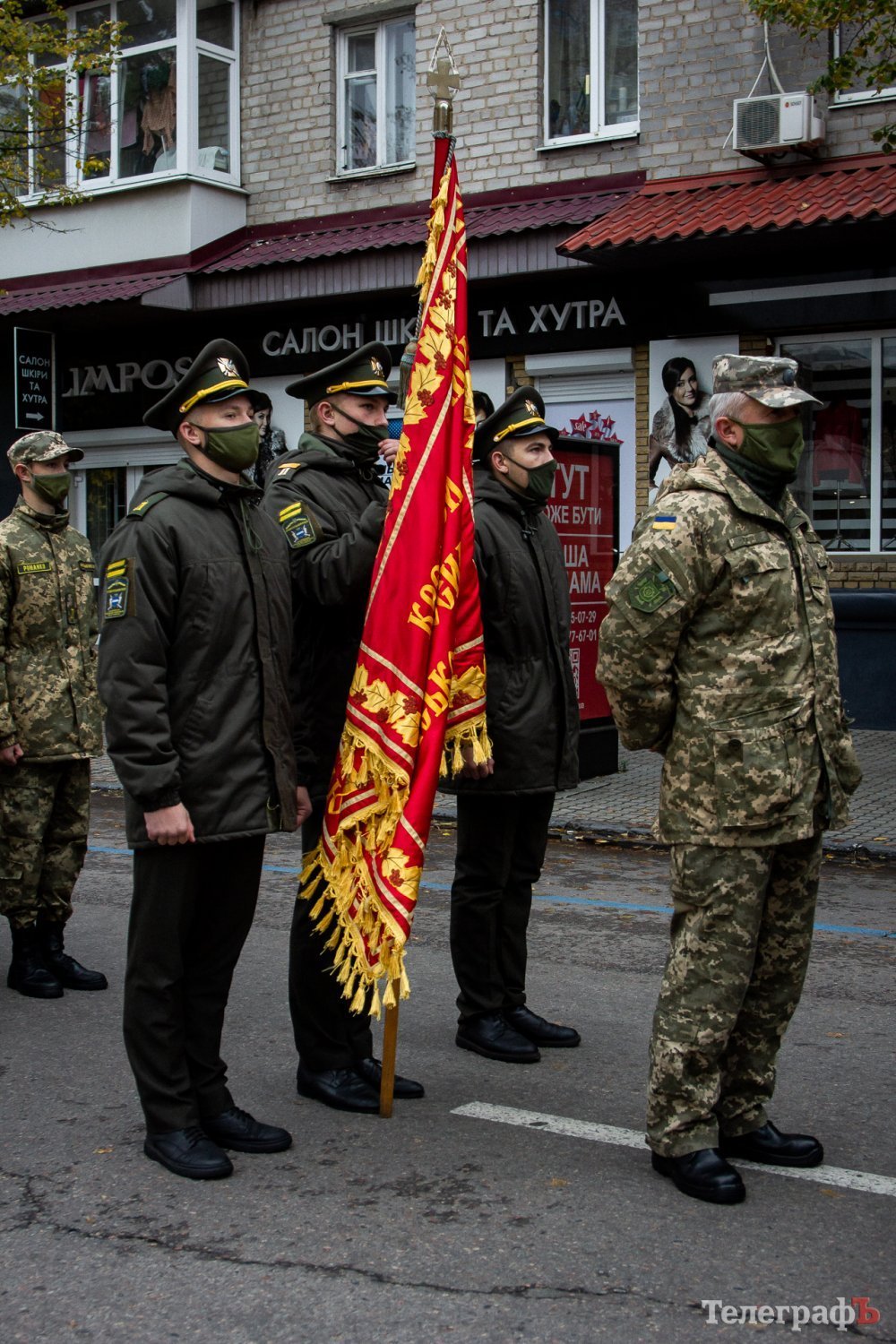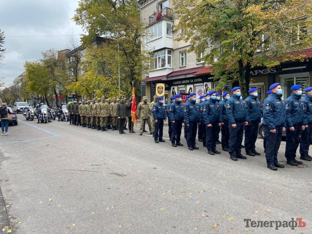 Перед духовим оркестром розмістилися депутати та чиновники. За музичним супроводом йшла коробка нацгвардійців, яку очолив командир Кременчуцького батальйону Національної Гвардії України Олег Довгалюк. Далі розташувалися ліцеїсти Кременчуцького військового ліцею з посиленою фізичною підготовкою, який досі намагаються реорганізувати. Замикали колону мотоциклісти з прапорами України.