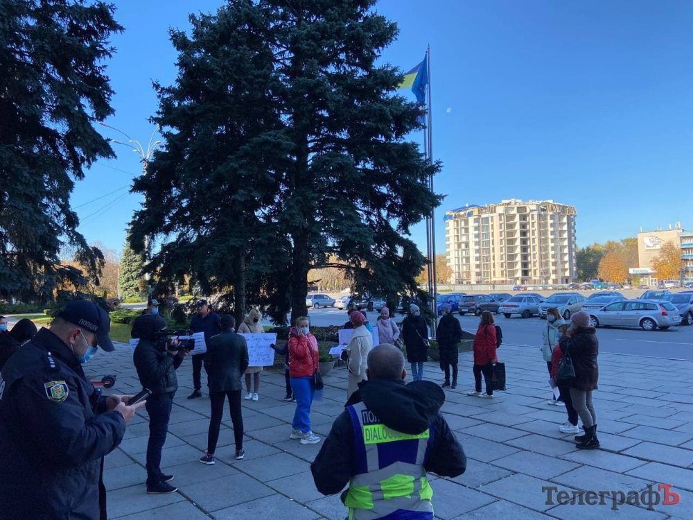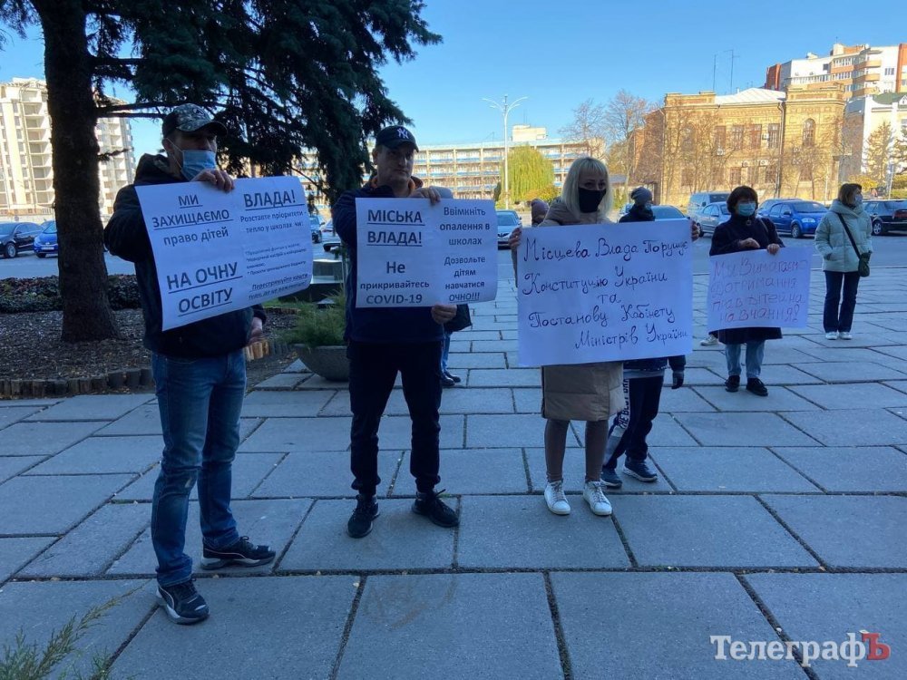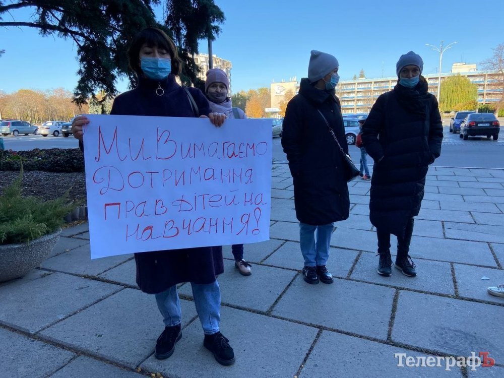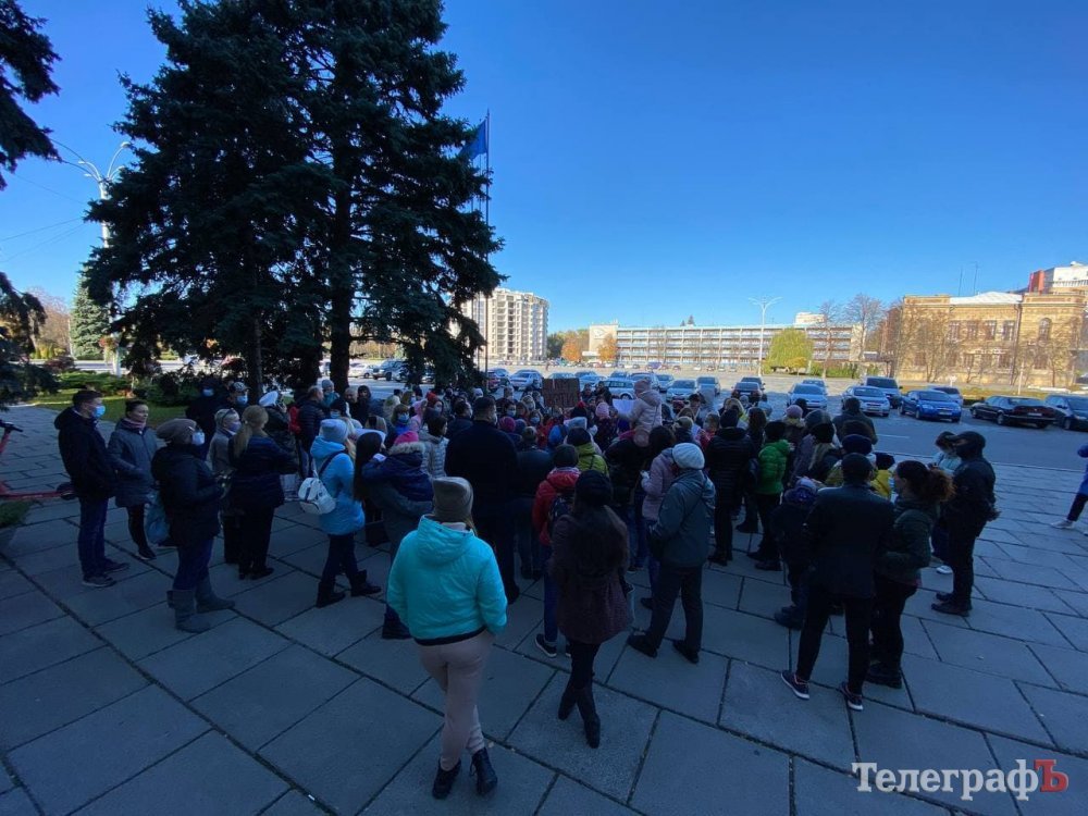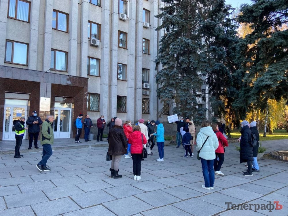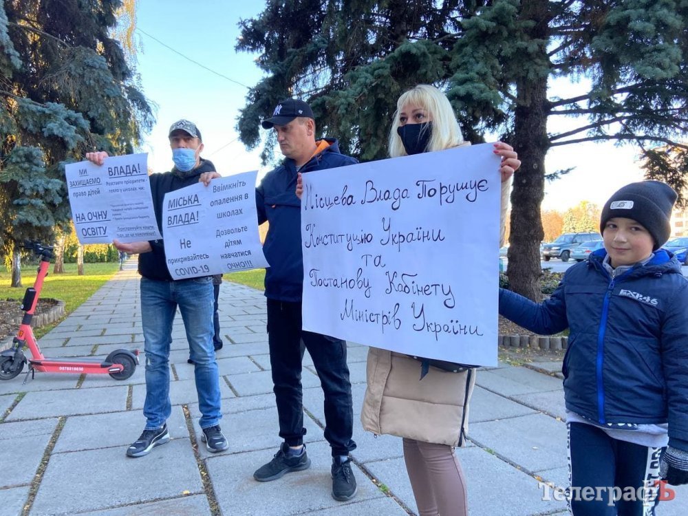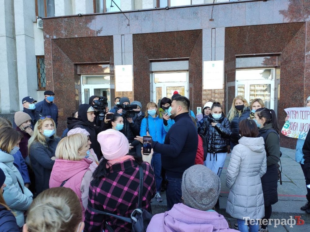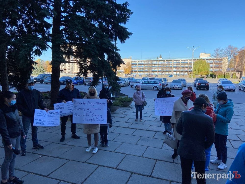 Зранку 25 жовтня батьки кременчуцьких школярів пікетують мерію, бо вони проти дистанційного навчання.