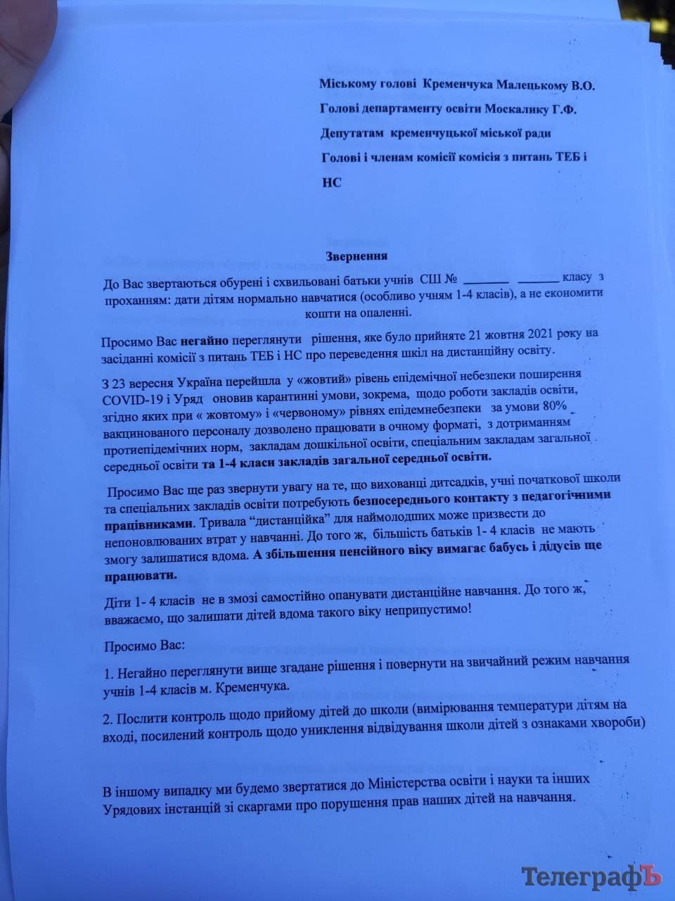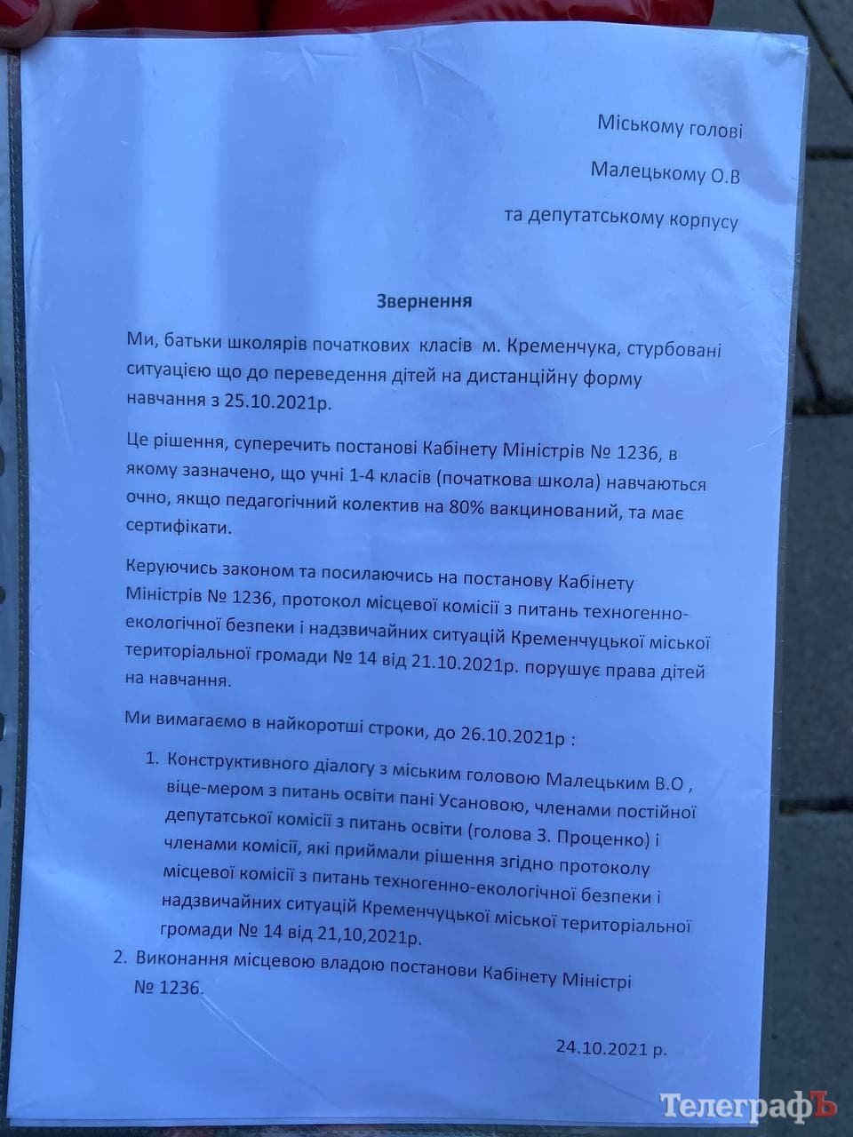 Вони стверджують, що, згідно з Постановою Кабміну №1236, учні початкових класів можуть навчатися очно, якщо педагогічний колектив вакцинований на 80% і більше та має ковід-сертифікати про щеплення. А тому рішення місцевої влади щодо переведення дітей на дистанційне навчання порушує права юних кременчужан.