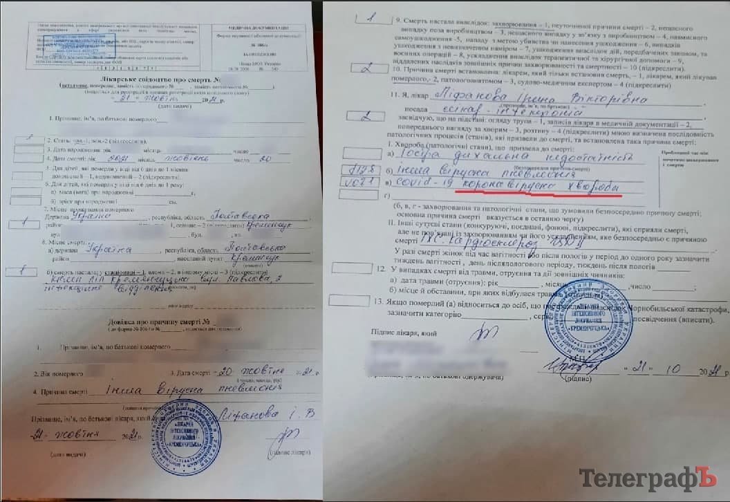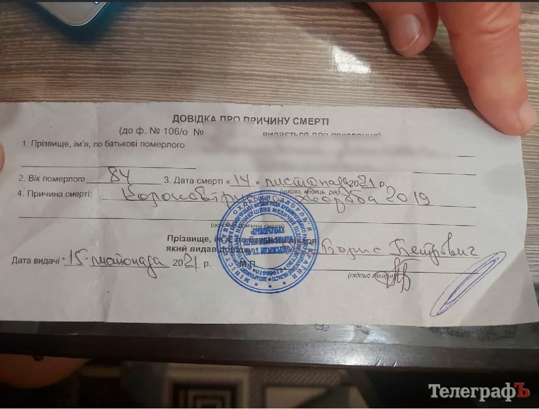 На заклик «Телеграфа» 24 листопада щодо пошуку вакцинованих померлих відгукнулися дві кременчуцькі родини. Як виявилося, є щонайменше два випадки смерті щеплених кременчужан, які не ввійшли до офіційної статистики від мерії. Далі ми публікуємо дві історії хвороби зі слів родичів (імена змінені на прохання рідних) та документи, які підтверджують, що кременчужани померли саме від COVID-19.