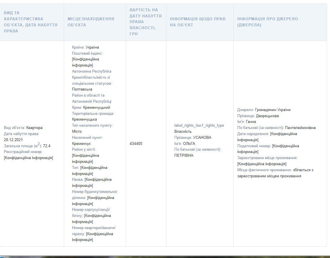 Віцемерка Ольга Усанова 28 грудня придбала квартиру площею 72,4 кв метра. Про це стало відомо із Єдиного державного реєстру декларацій НАЗК — пані Усанова 4 січня подала декларацію про суттєві зміни в майновому стані, вказавши вартість квартири на дату набуття – 434 400 грн (еквівалент 16 тисяч доларів). Продавець квартири — Дворецькова Ганна.