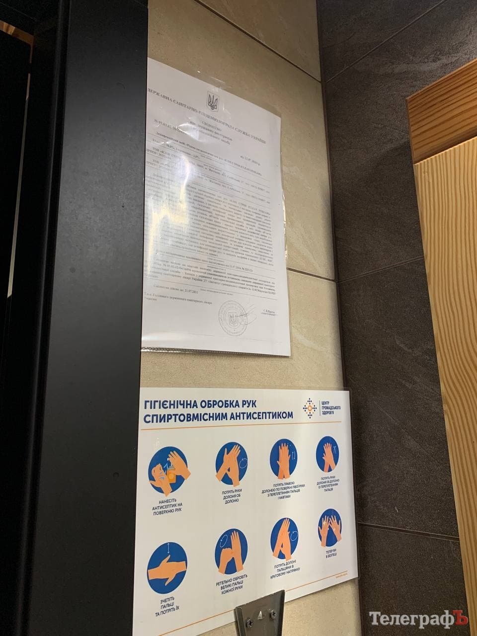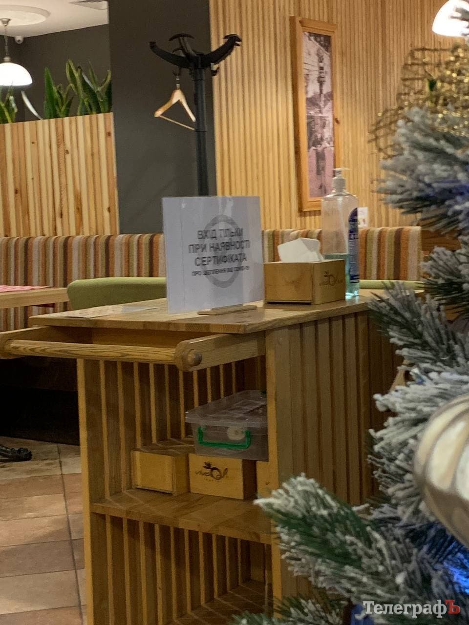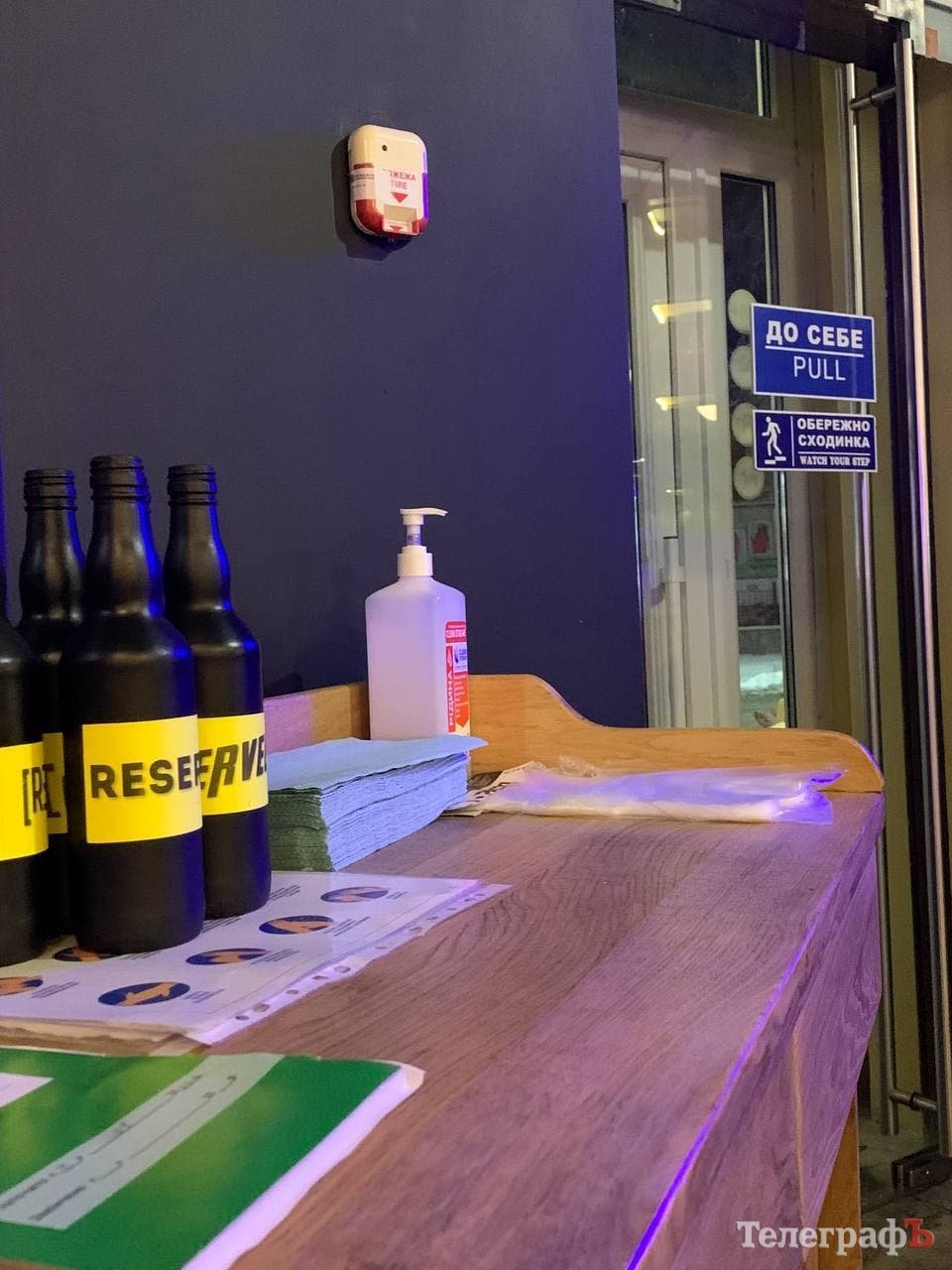 Одразу всередині гостей зустрічає зона з дезінфектором та серветками, також розташована табличка з інформацією про те, що вхід дозволений тільки при наявності сертифіката.