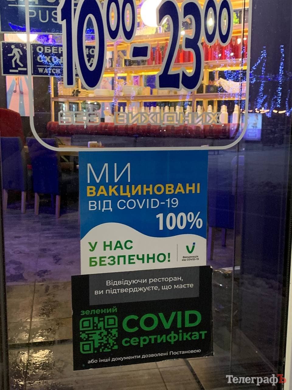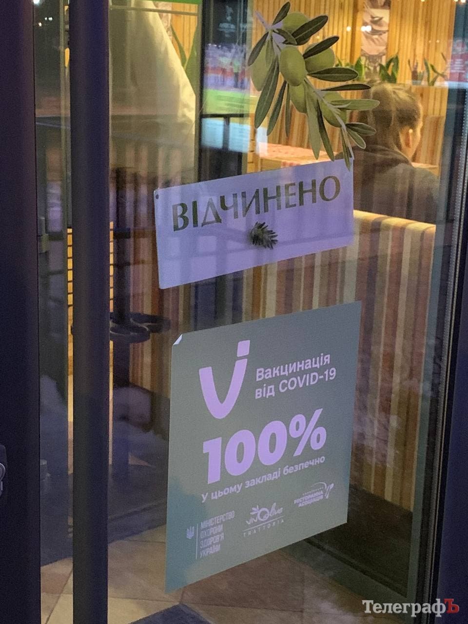 На дверях головного входу розміщена інформація, що персонал вакцинований й те, що відвідувач повинен мати сертифікат, або інший документ.