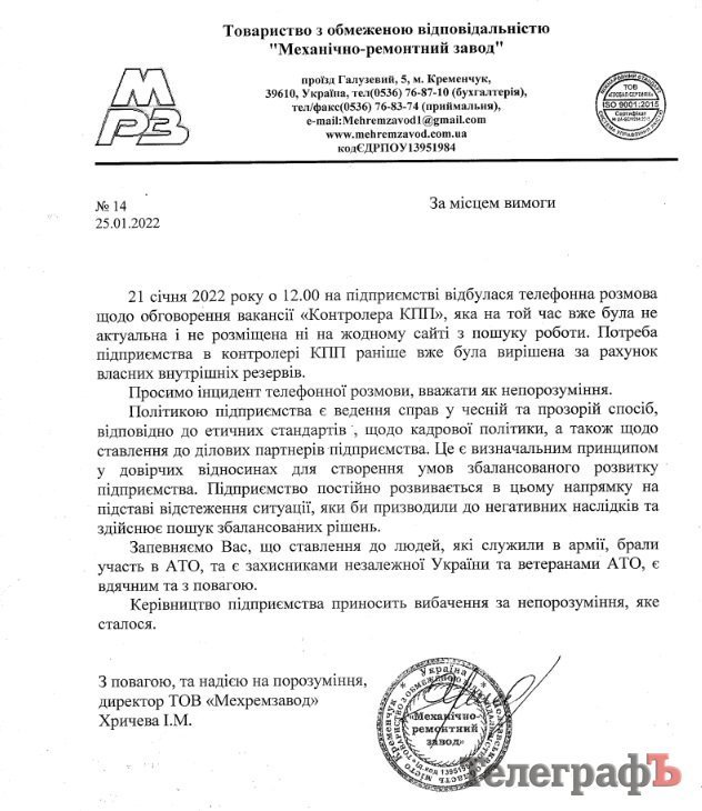 24 січня до нашої редакції звернувся кременчужанин, якого не взяли на роботу на механічо-ремонтний завод, бо він учасник бойових дій. Для підтвердження своїх слів він надав нам відеозапис розмови з інспектором по кадрах.