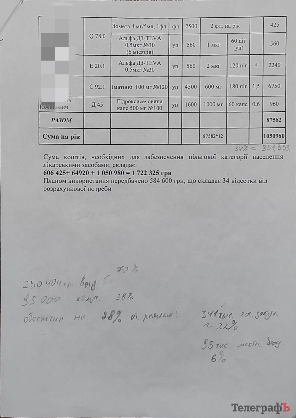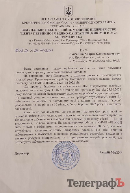 На письмове звернення щодо того, на яку суму Андрій був забезпечений ліками у 2021 році, директор ЦПМСД Андрій Мазур відповів, що ця сума становить 626 000 гривень (як з міського, так і з державного бюджету). Але по факту, за словами Андрія, до нього дійшло близько 404 000 гривень, з них 95 000 – з міського бюджету.