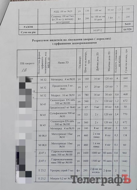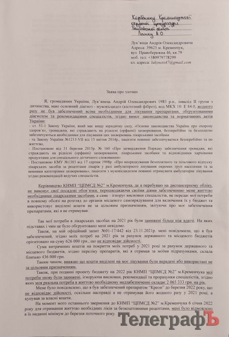 За висновком комісії Департаменту охорони здоров’я Полтавської ОДА, у 2021 році Андрій потребував ліків на 1 571 123 гривні. Саме цей документ став підставою для формування бюджету Центру первинної медико-санітарної допомоги №2, який надалі передав інформацію у департамент охорони здоров’я Кременчука. Але передав не в повному обсязі: цифра, зазначена в бюджеті медичної установи, становить усього 47% від зазначеної у висновку комісії – 736 500 гривень. Більше того, проєкт бюджету місто профінансувало не повністю – лише на 34%.
