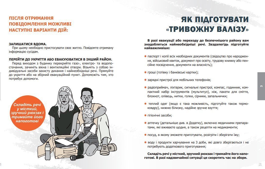 Центр стратегічних комунікацій та стратегічної безпеки при Міністерстві культури та інформаційної політики видав брошуру. В ній розповідається як діяти у випадку надзвичайної ситуації або війни. Крім порад про критичне мислення і протидію фейкам тут є й практичні поради, у тому числі – щодо вмісту аптечки і « триважної валізки». Брошуру можна завантажити за посиланням.