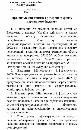 У розпорядженні йдеться про те, що кошти знаходитимуться на ескроу-рахунках Мінінфраструктури, аби гарантувати безпеку польотів на території України з 14 лютого і до «врегулювання зовнішньополітичних загроз». Такий крок допоміг: перевезення відновили.