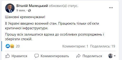 18.12 У Кременчуці вводиться комендантська година з 22.00 до 6.00. Як повідомив міський голова Віталій Малецький, у цей час забороняється перебування на вулицях.