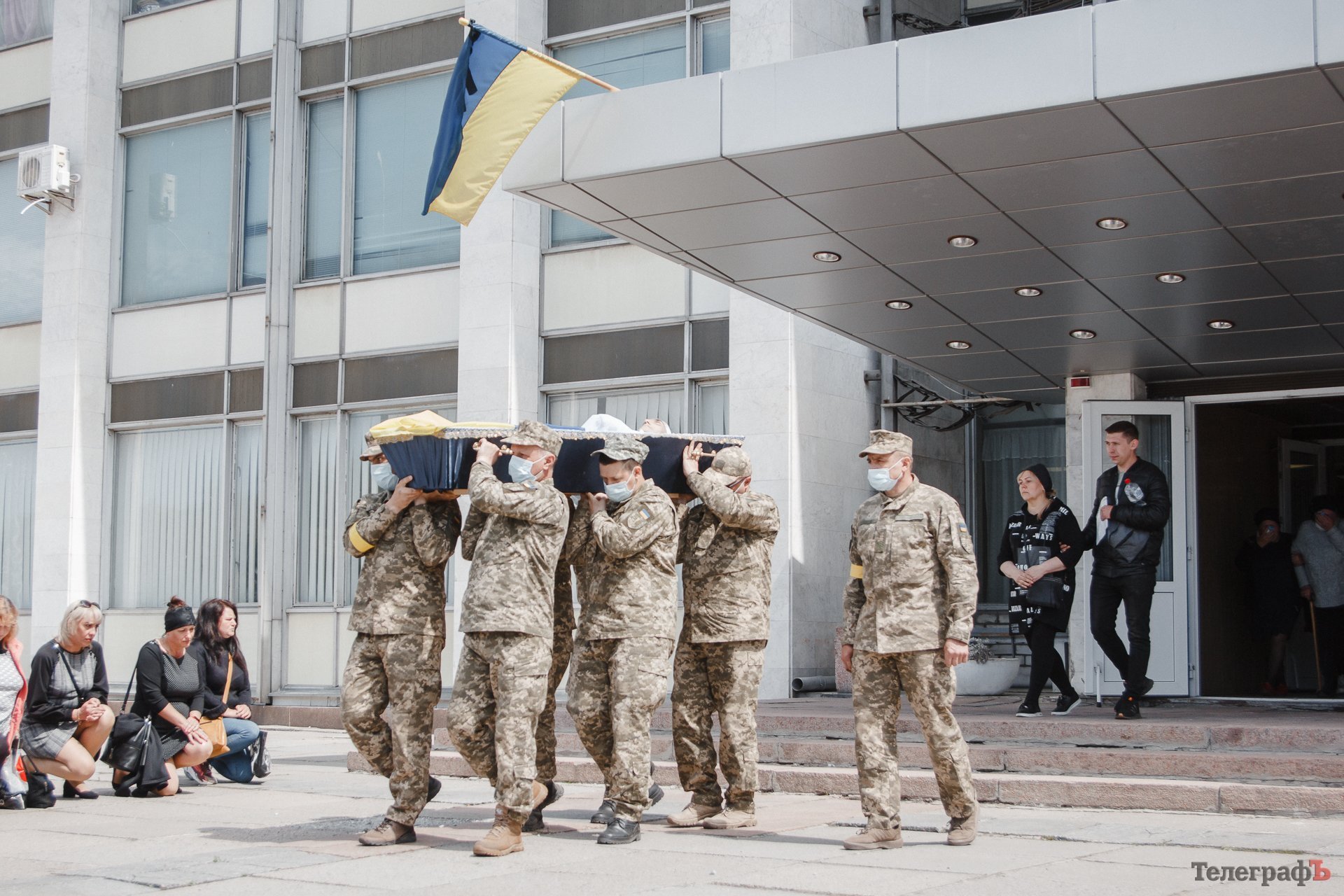 Рідні схилилися над домовиною Олександра Захарченка, яке огорнуте жовто-блакитним стягом України