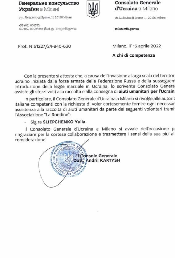 Зв'язалась з нашими волонтерами, вони сказали що потрібно. Отримала офіційний дозвіл через консульство в Мілані на волонтерство. Тут дуже важко жити і вести будь-яку діяльність, але українці все зможуть.