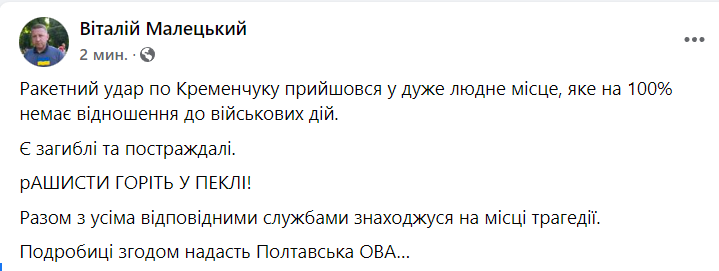 У Кременчуці влучання в цивільний об?єкт. На жаль, є постраждалі. Більше подробиць згодом, – голова Полтавської ОВА Дмитро Лунін
