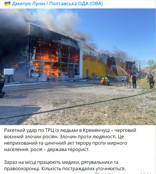 У торгівельно-розважальний центр в місті Кременчук російські окупанти влучили ракетами Х-22, випущених із дальніх бомбардувальників Ту-22 М3. Літаки рашистів злетіли з аеродрому Шайковка, а пуски здійснювались з Курської області.