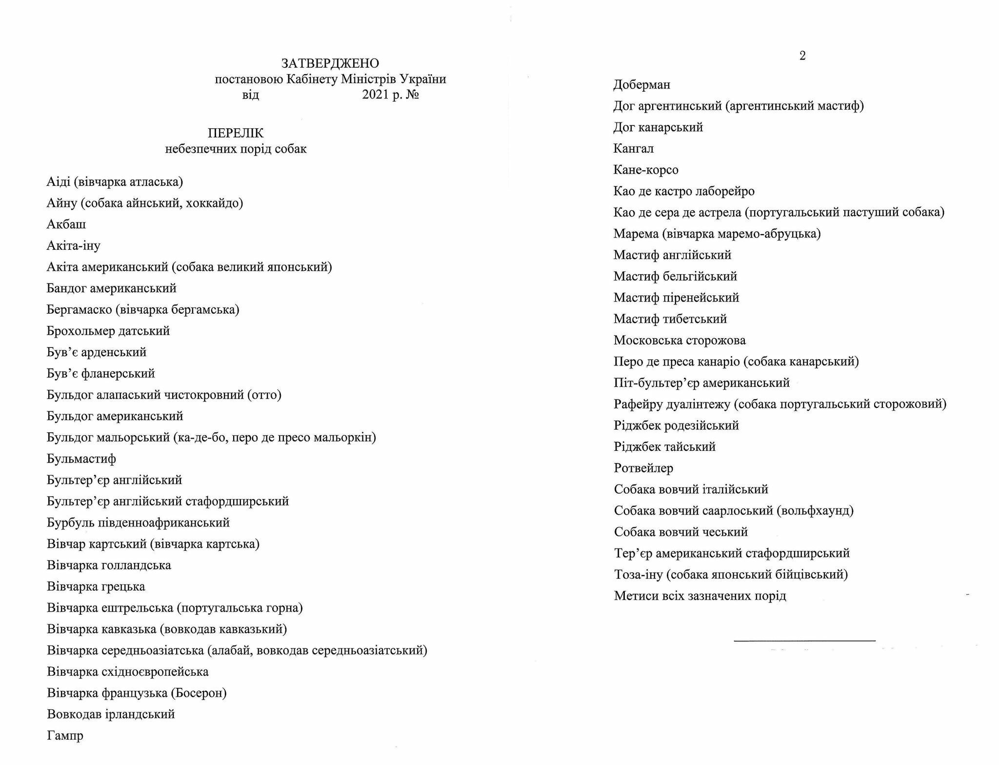 До речі, 10 листопада минулого року Кабмін затвердив перелік небезпечних порід собак. До нього внесли доберманів, догів, ріджбеків, мастифів, ротвейлерів, бульдогів, бультер’єрів, вівчарок, вовкодавів та інших – усього 51 порода.