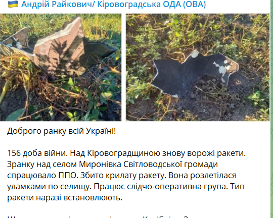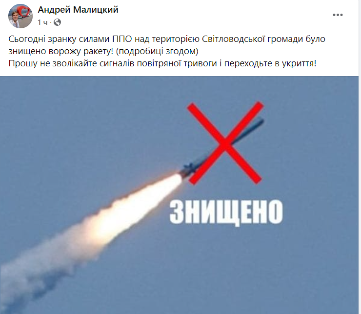 Вже зранку міський голова Світловодська Андрій Маліцький повідомив, що силами ППО над територією Світловодської громади було знищено ворожу ракету.