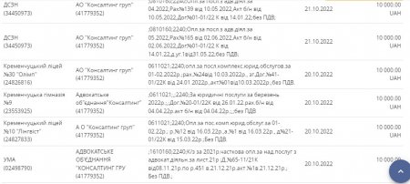 Так, на початку 2022 року усі 30 шкіл, ліцеїв та гімназій, що підпорядковуються Кременчуцькій міській раді, уклали прямі (неконкурентні) угоди на послуги з адвокатським об’єднанням «Консалтинг груп». Ці угоди на однакові суми — по 60 тисяч гривень на рік. Звіти про закупівлі розміщені в системі Prozorro. (Такі самі суми на даний вид послуг фігурували у звітах і за минулий 2021 рік.) В угодах частини шкіл вказана ціна однієї послуги — 5 тисяч гривень. Тобто саме таку суму, ніби абонентну плату, зобов’язалася платити адвокатам кожна міська школа. Або її зобов’язали платити — адже такі дружні дії керівників бюджетних організацій наводять на думки, що без адмінресурсу тут не обійшлося.