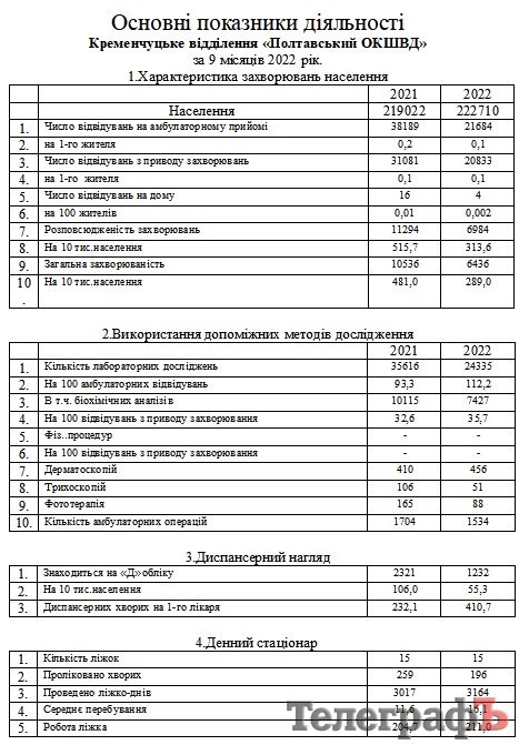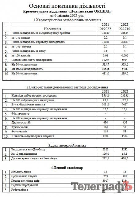Між іншим, за 2021 р. у кременчуцькому шкірвендиспансері проведено 38 189 прийомів, а в 2022 р. - 21 684 (9 міс.) + 2 046 (за жовтень) = 23 730. Не тільки повномасштабна війна наклала свій відбиток на кількість громадян, які отримали послуги ШВД цьогоріч, але й скорочення штату та перевод на 0,5 ставки тих лікарів, хто залишився. Тож, як можна побачити із цифр, потреба у цьому закладі охорони здоров'я у Кременчуці та агломерації чимала.
