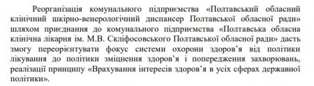 У Полтаві вирішили реорганізувати КП «Полтавський обласний клінічний шкірно-венерологічний диспансер Полтавської обласної ради» і КП «Полтавський обласний клінічний госпіталь для ветеранів війни Полтавської обласної ради» шляхом приєднання їх до КП «Полтавська обласна клінічна лікарня ім. М.В. Скліфосовського Полтавської обласної ради».