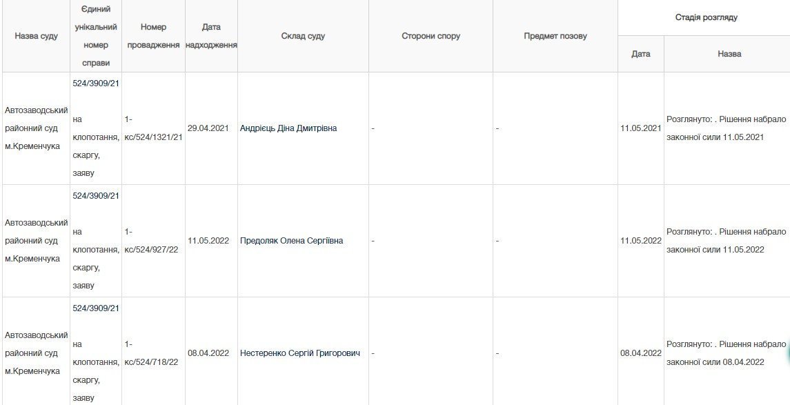 Примітка: ухвалу Автозаводського районного суду від 11.05.22 року ми знайшли через аналітичну систему YouControl, яка агрегує дані з відкритих державних реєстрів. У Єдиному державному реєстрі судових рішень наразі ухвала недоступна. Під час війни він працює в тестовому режимі, і доступ до деяких рішень обмежено. Але сліди того, що у справі є рух, знаходимо на порталі «Судова влада».