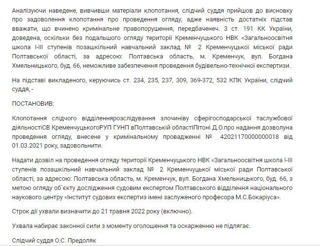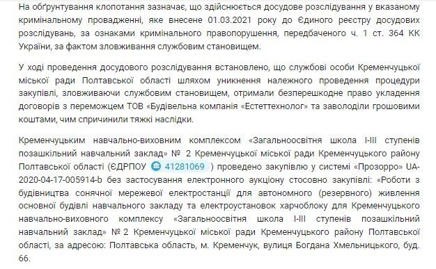 Поліція продовжує розслідувати кримінальну справу щодо будівництва сонячної електростанції у школі №2. Це один із проєктів «Громадського бюджету», який активно просував на Ревівці депутат міської ради Денис Терещенко. У справі фігурує ТОВ «Будівельна компанія «Естеттехнолог», керівником та бенефіціарним власником якої є все той же Денис Терещенко. Справа порушена за ознаками ч. 1 ст. 364 КК України (зловживання службовим становищем). Як стало відомо з матеріалів ухвали Автозаводського районного суду від 11.05.22 року, у справі призначили будівельно-технічну експертизу в інституті Бокаріуса. І слідство попросило надати дозвіл на проведення огляду території школи, де відбувалося будівництво. Суд задовольнив це клопотання. Відповідно до ст. 237 КПК, при огляді слідчий, прокурор або, за їхнім дорученням, залучений спеціаліст має право проводити вимірювання, фотографування, звуко- чи відеозапис, складати плани й схеми, виготовляти графічні зображення оглянутого місця чи окремих речей, виготовляти відбитки та зліпки, оглядати й вилучати речі й документи, які мають значення для кримінального провадження.