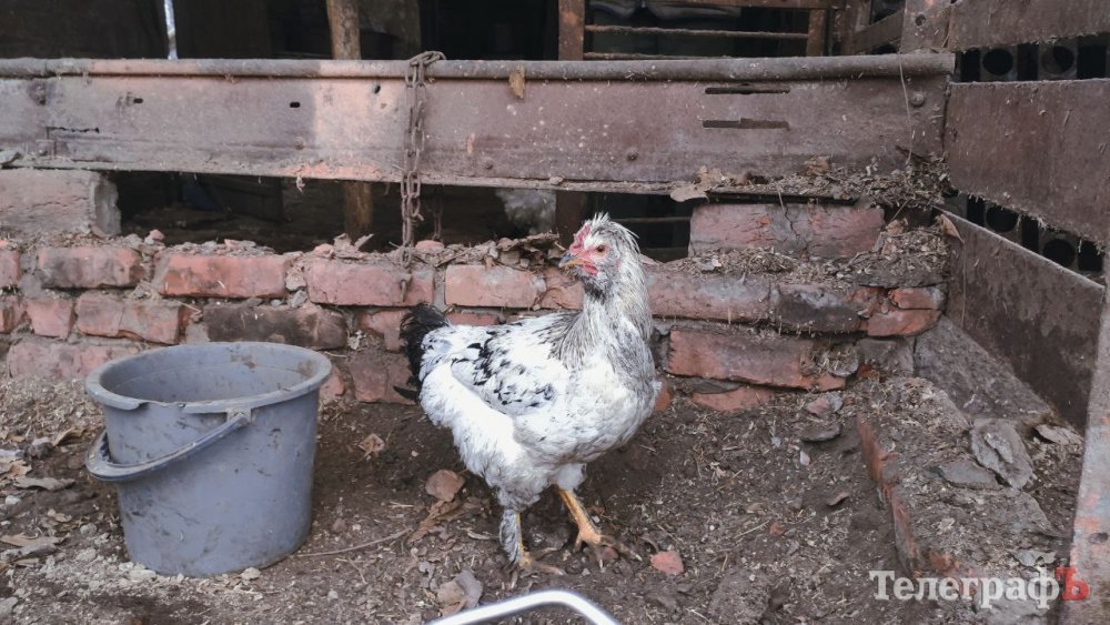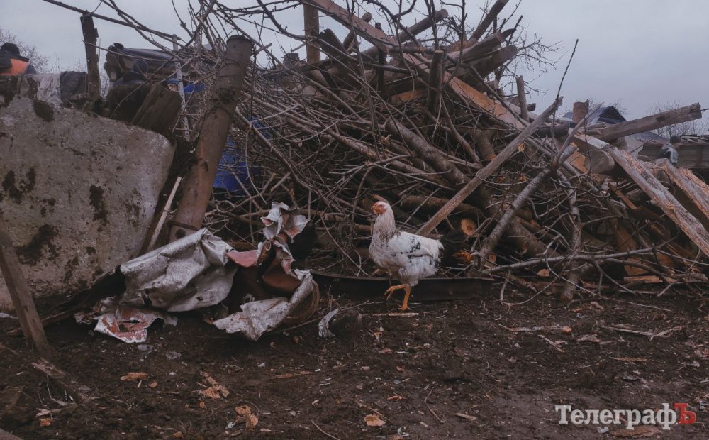 Поруч зруйнований сарай, який прийняв частину вибуху на себе. У розвалинах між людьми бігають перелякані кури.