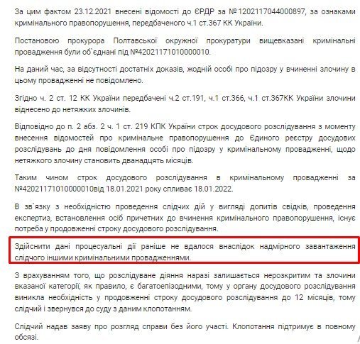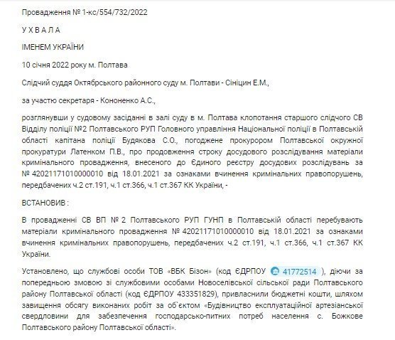 Цю справу ми знайшли за допомогою системи YouControl — із Єдиного державного реєстру судових рішень вона наразі «зникла» вже після того, як була завантажена. (Ми вже писали про такі випадки раніше). Йдеться про будівництво артезіанської свердловини в селі Божкове. Чим завершилася справа, наразі невідомо, але поліція не поспішала проводити слідчі дії. Термін розслідування сплив, суд продовжив його лише на пів року — до 18.07.22. Цілком можливо, що провадження вже закрили, бо «вийшли строки».