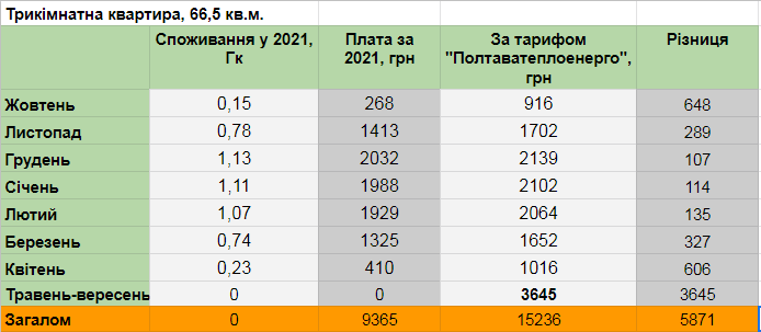 Минулого року за опалення сплачено 9365 грн. За тарифами «Полтаватеплоенерго» при такому самому споживанні оплата за рік складатиме понад 15 тис. грн (+62%). З них в опалювальний сезон — 11591 грн (+20%), абонплата (728 грн щомісяця) за квітень-вересень — 3645 грн.