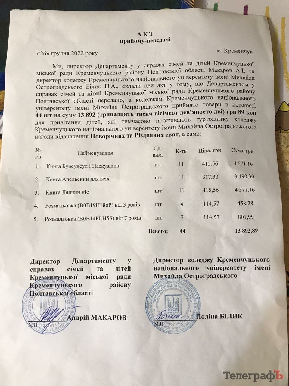 – Ви передали книжки у якості привітання дітям-переселенцям, що живуть у гуртожитку коледжу КрНУ Остроградського, разом з актом прийому-передачі книжок директору коледжу. Скажіть, будь ласка, ви закуповували ці книжки за кошти міського бюджету?