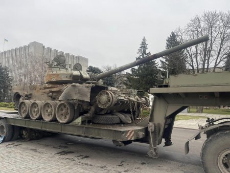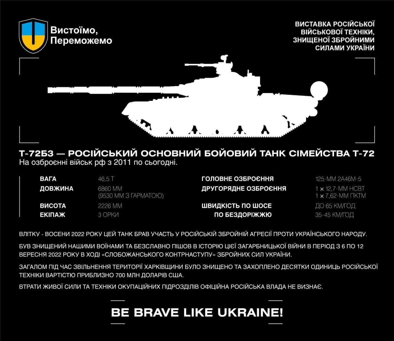 На цьому танку рашисти хотіли захопити Україну, але він був знищений нашими захисниками під час звільнення сусідньої Харківщини. Цей танк – лише один з багатьох тисяч одиниць російської техніки, яку наші воїни перетворили на металобрухт.