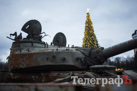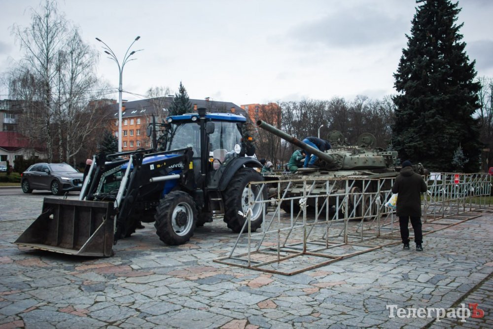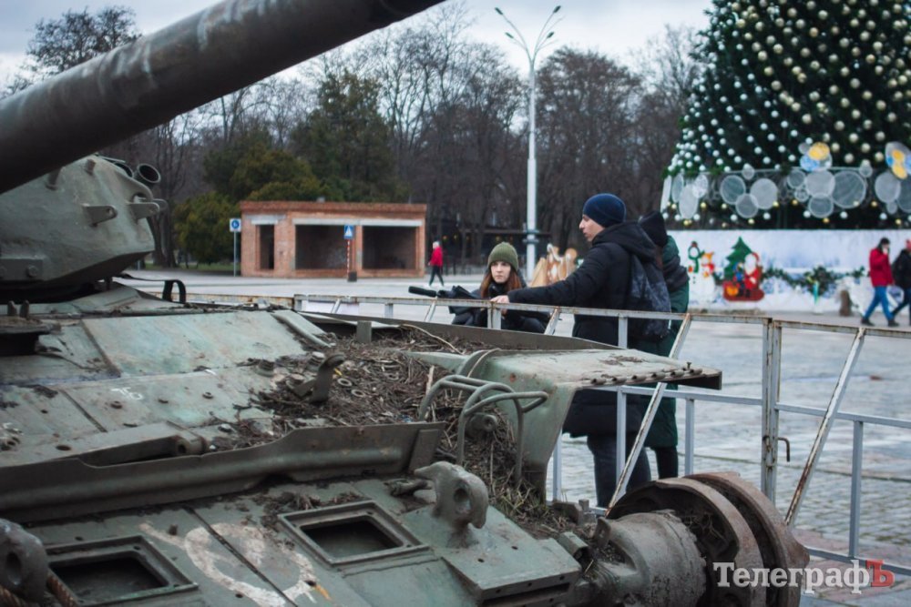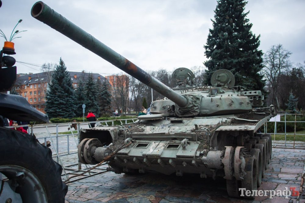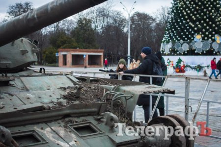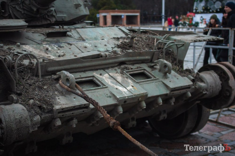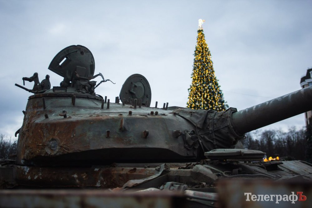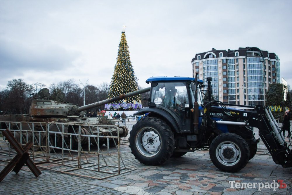 Біля головної ялинки Кременчука встановили знищений російський танк Т-72.