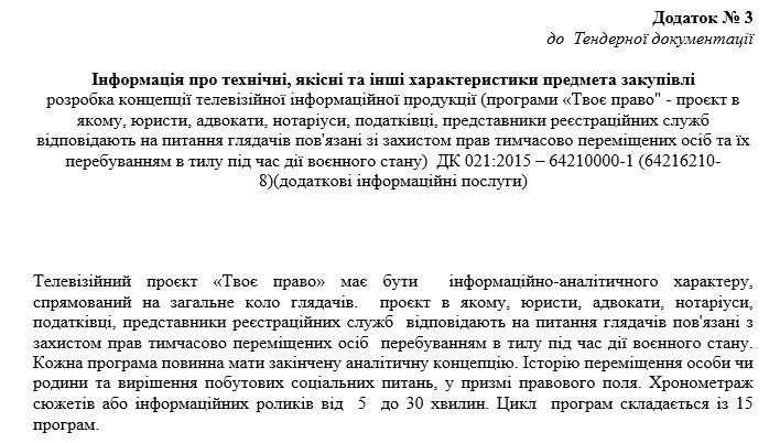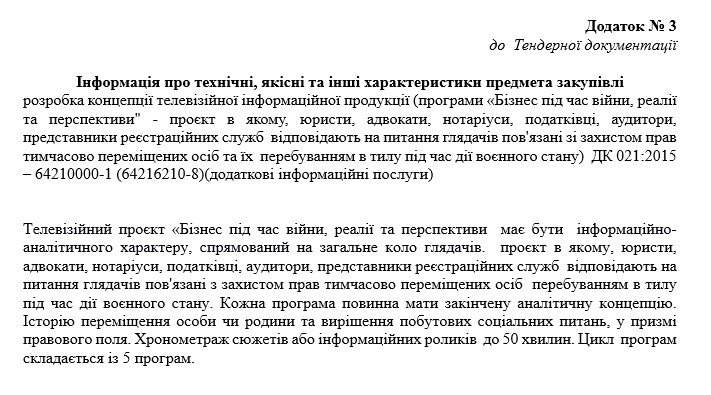 При цьому КТРК замовила не готові телепродукти, а концепції телепрограм «Твоє право» (оголошення від 3.12.22) і «Бізнес під час війни, реалії та перспективи» (оголошення від 5.12.22). Предмет закупівель визначений як «Послуги телефонного зв’язку та передачі даних» — «Додаткові інформаційні послуги». Строки виконання робіт також прискорені — до 31.12.22 року.
