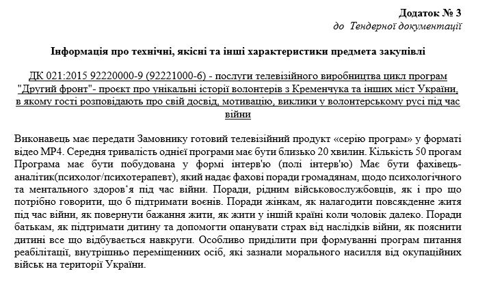 Цикл програм «Другий фронт», як сказано в описі предмету закупівлі, має бути «про унікальні історії волонтерів з Кременчука та інших міст України, в якому гості розповідають про свій досвід, мотивацію, виклики у волонтерському русі під час війни».