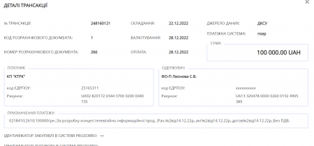 До речі, у 2022 році КТРК стала єдиним державним замовником ФОП Леонової. Сума її держзамовлень стала більшою, ніж у попередні роки.