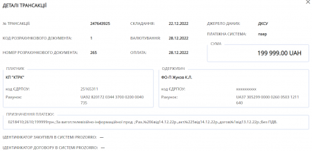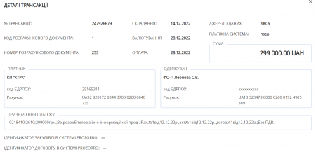 Сума все та ж — 199 999 тис грн. Термін дії договору теж незмінний — до 31 грудня 2022 року. І підприємець встиг виконати договір за один день! За даними порталу публічних фінансів, акт виконаних робіт (на всю суму, за договором від 13.12.22 р.) підписали 14 грудня, і цього ж дня КТРК перерахувала гроші підприємцю. І це підтверджує нашу версію про те, що торги оголошувалися суто формально, і виконавець послуг був визначений заздалегідь.