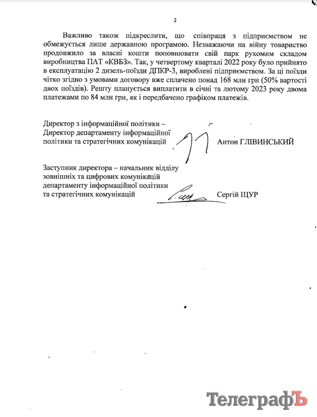 АТ «Укрзалізниця» відповіла на інформаційний запит «Кременчуцького Телеграфа», у якому ми запитували, із чим пов’язана заборгованість товариства перед Крюківським вагонобудівним заводом (ПАТ «КВБЗ») за виготовлені та поставлені вагони.