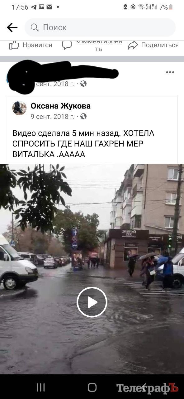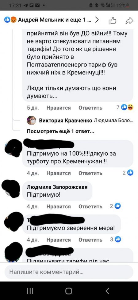 А ось скрін зі сторінки кременчужанки, що пише про підтримку мера під його постом. Трохи погортали її сторінку і вже інша риторика підтримки мера: