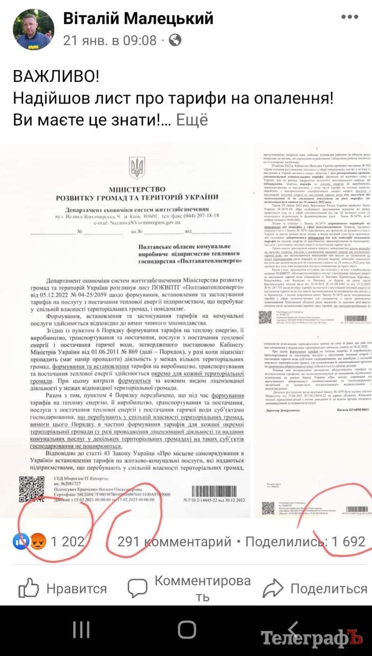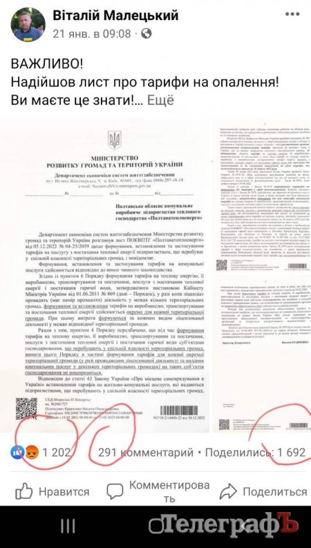 Отже, у середньому пости мера на його сторінці у ФБ набирали десь до 40 коментарів, частіше ще близько 20. Проте один пост, від 21 січня, просто розбомбив аудиторію – майже 300 коментарів, 1700 репостів та 1200 лайків! Це був «лист про тарифи на опалення» від Міністерства розвитку громад України та коментар Малецького щодо підвищення тарифів: «переконаний, що це незаконно та потребує невідкладного вирішення».