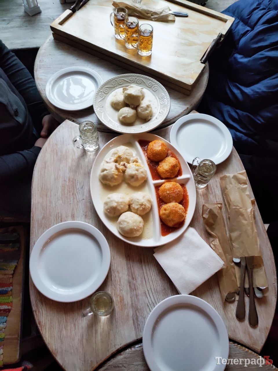 Після фото зі пам’ятником саме час скуштувати автентичну полтавську страву. За «наводкою» ми пішли до закладу «Комора». Обрали сет парових галушок — із печінкою, крем-сиром, у томатному та вершковому соусі, спробували смажені галушки. До галушок — сет із шикарних міцненьких настоянок. Все — дуже смачно та адекватно по сумі.